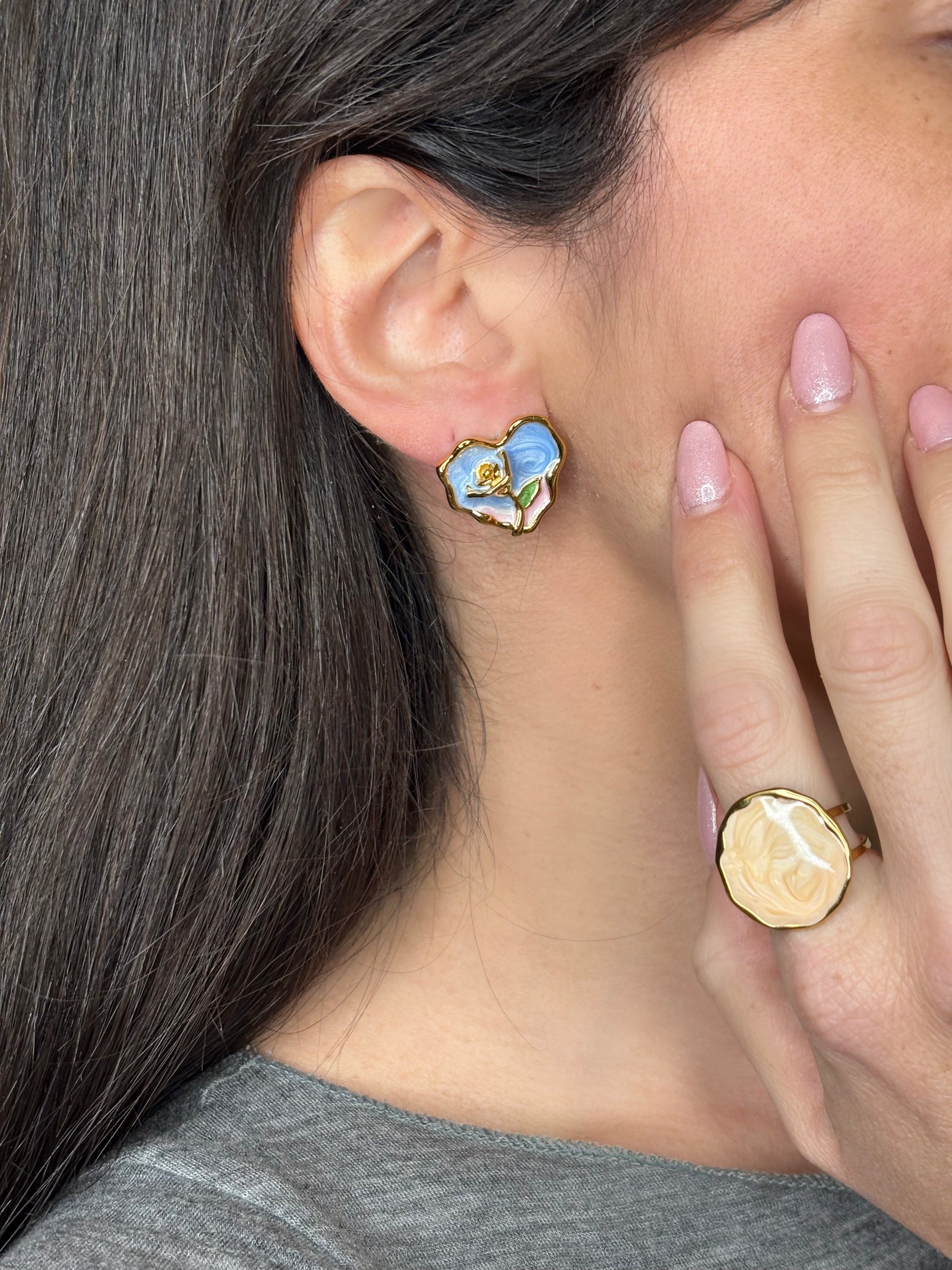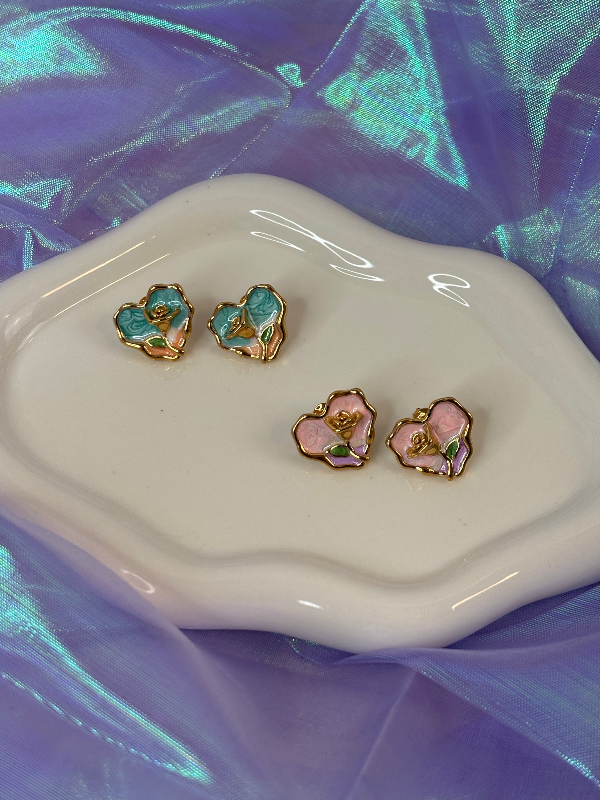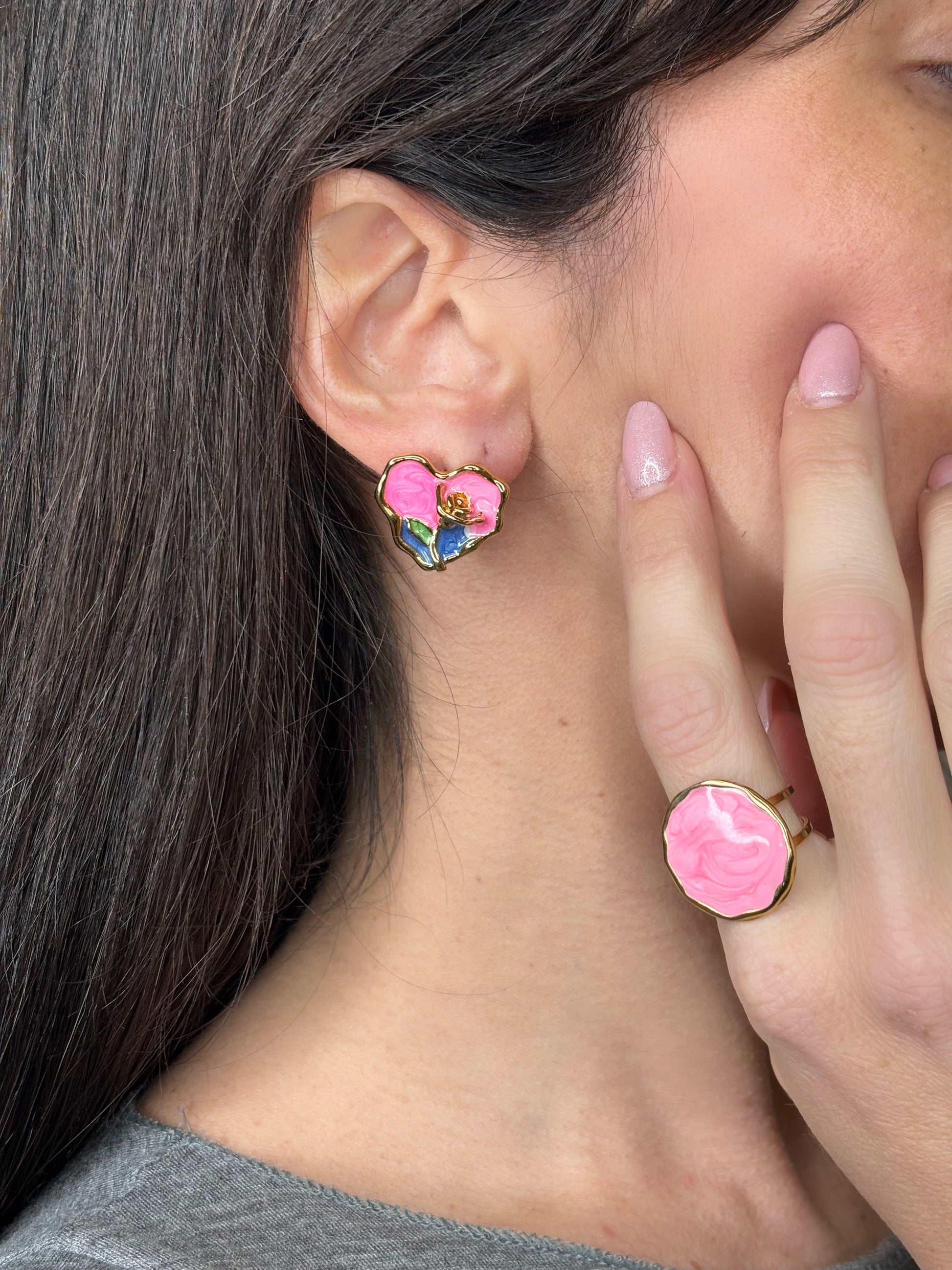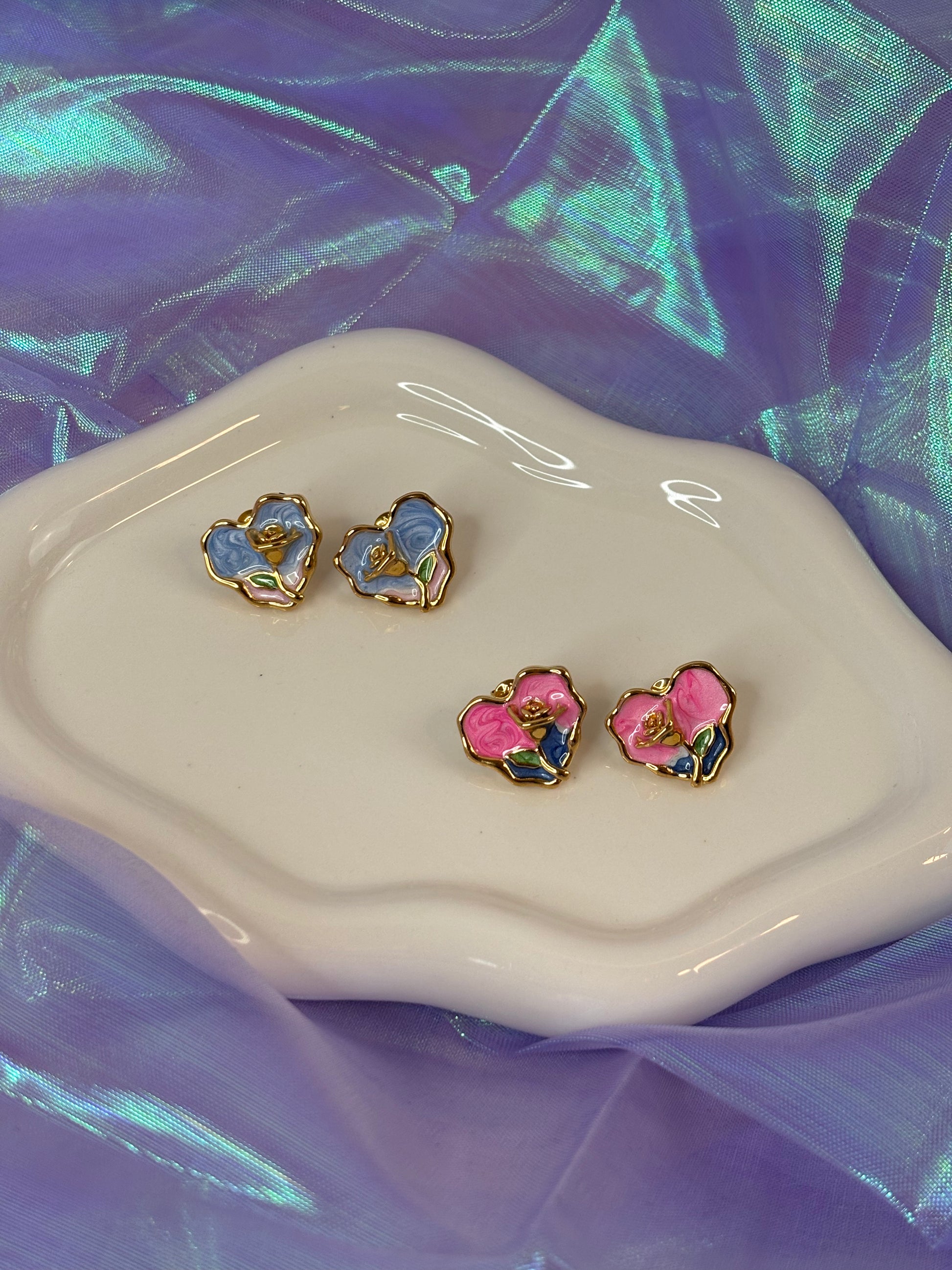 Un tocco romantico in chiave moderna: questi orecchini in acciaio inox presentano una forma a cuore smaltata, impreziosita da una delicata rosa in rilievo. Piccoli capolavori floreali da indossare ogni giorno per aggiungere eleganza e dolcezza al tuo stile.