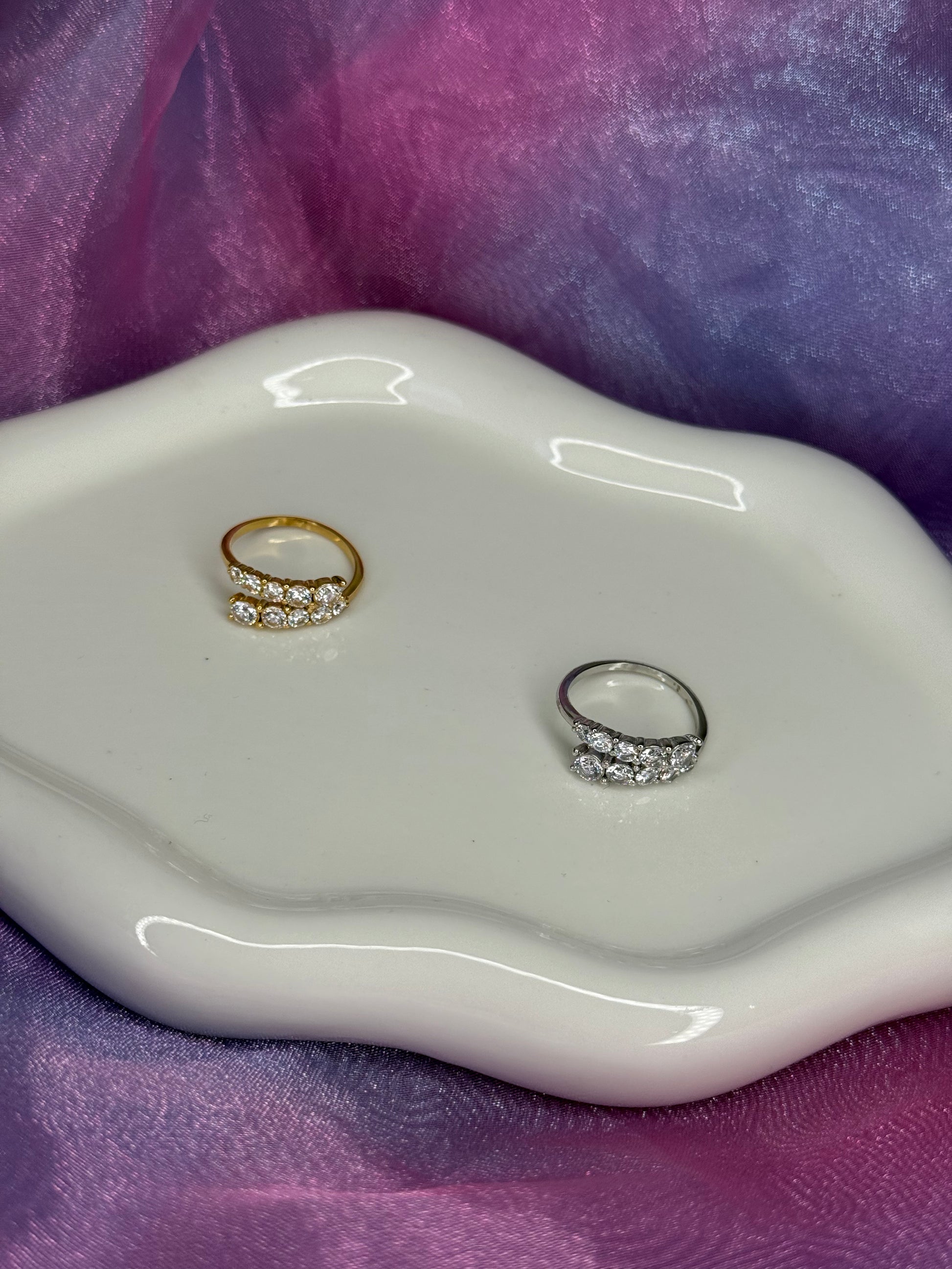 Anello in acciaio inox con con doppia fila di zirconi intrecciati. Il design tridimensionale amplifica la brillantezza e crea un effetto luminoso da ogni prospettiva. Elegante e versatile, perfetto per chi apprezza il design contemporaneo.