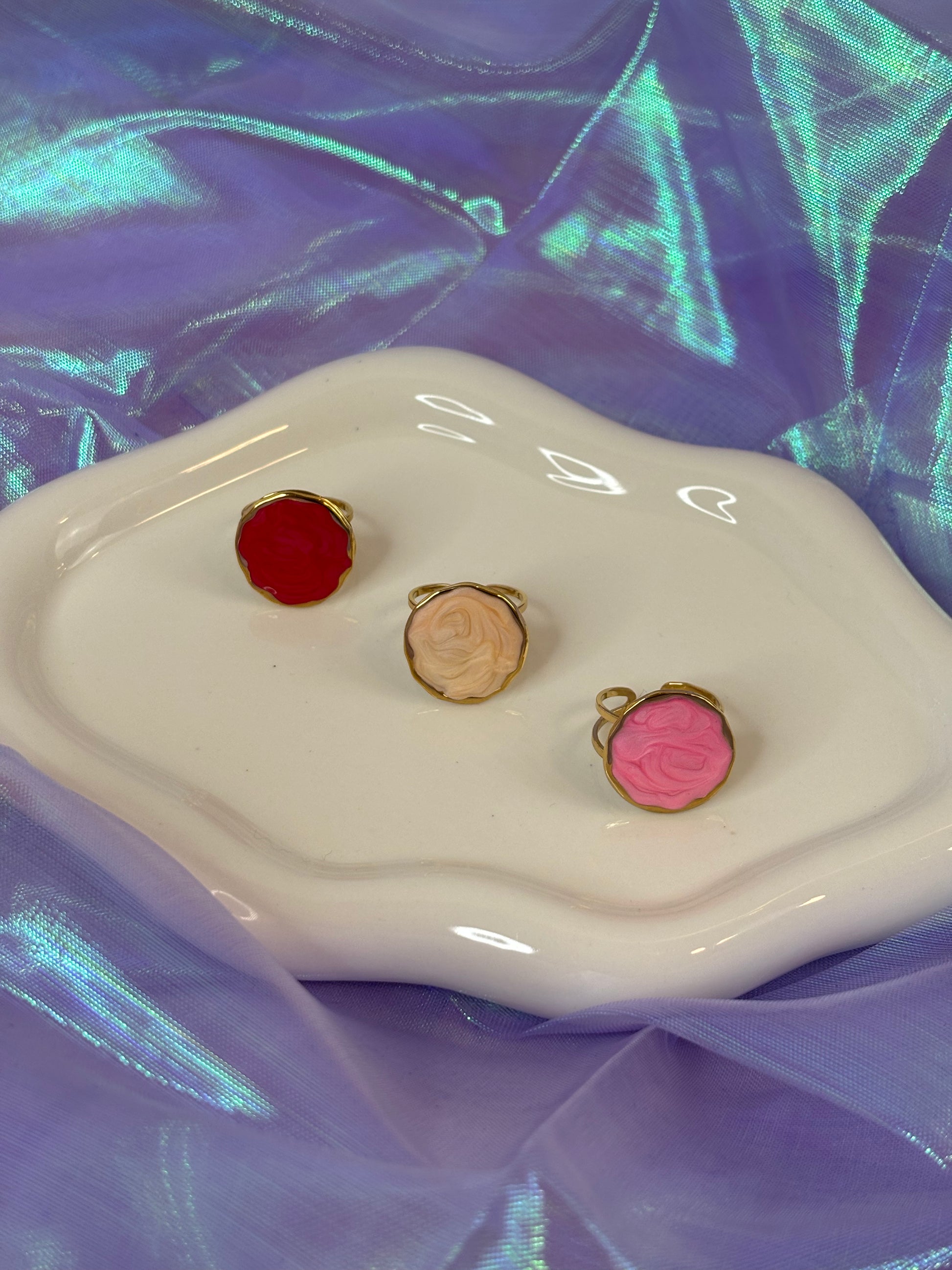 Questo anello rotondo in acciaio inox è decorato con smalto colorato, che richiama un effetto dipinto a mano. Un gioiello che unisce design contemporaneo e un tocco artistico, perfetto per chi cerca un accessorio unico e creativo.