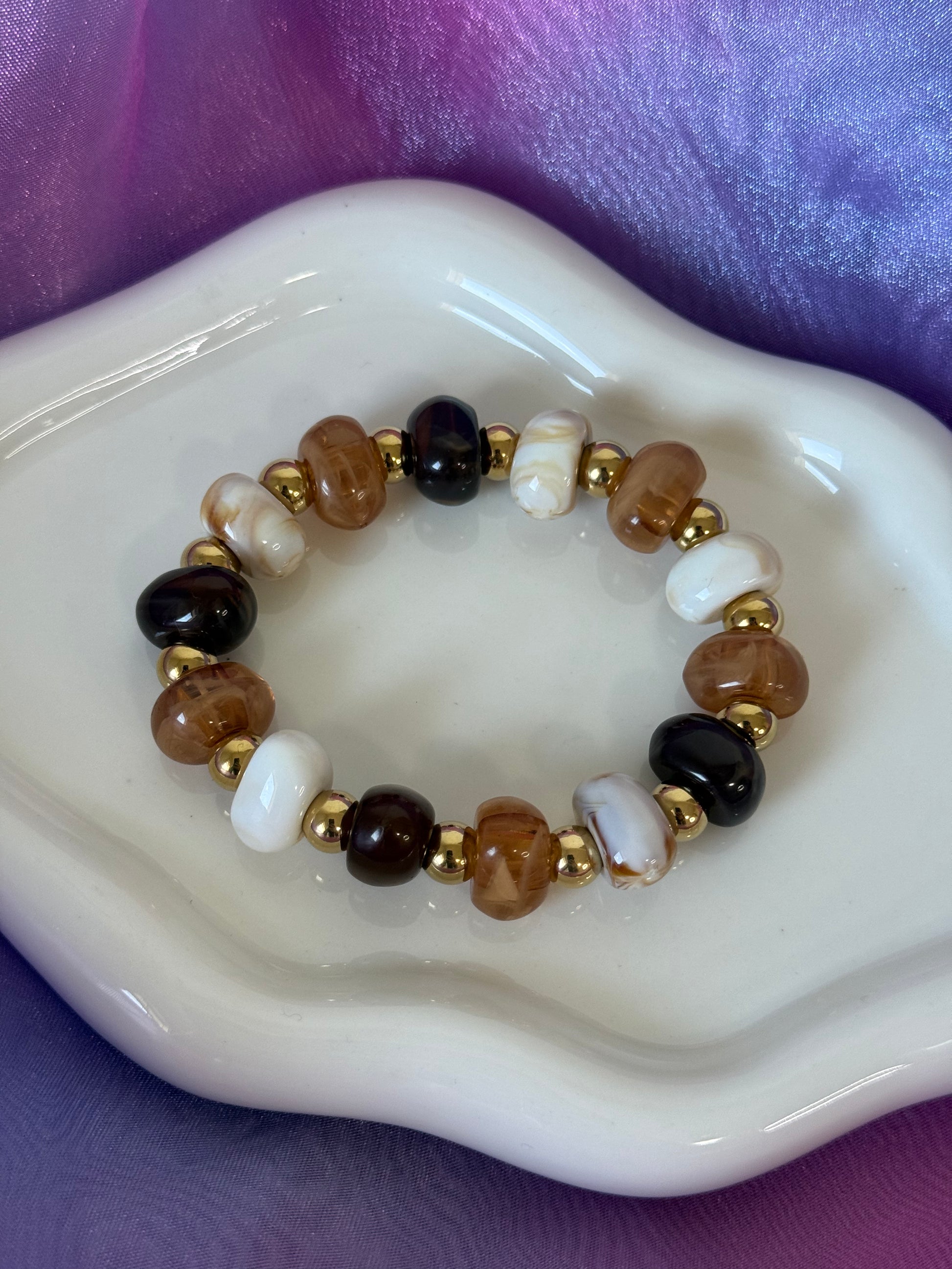 Bracciale con pietre marroni, nere e bianche. Elegante e naturale, con un mix armonioso di tonalità calde e neutre che dona stile e versatilità a ogni look.
