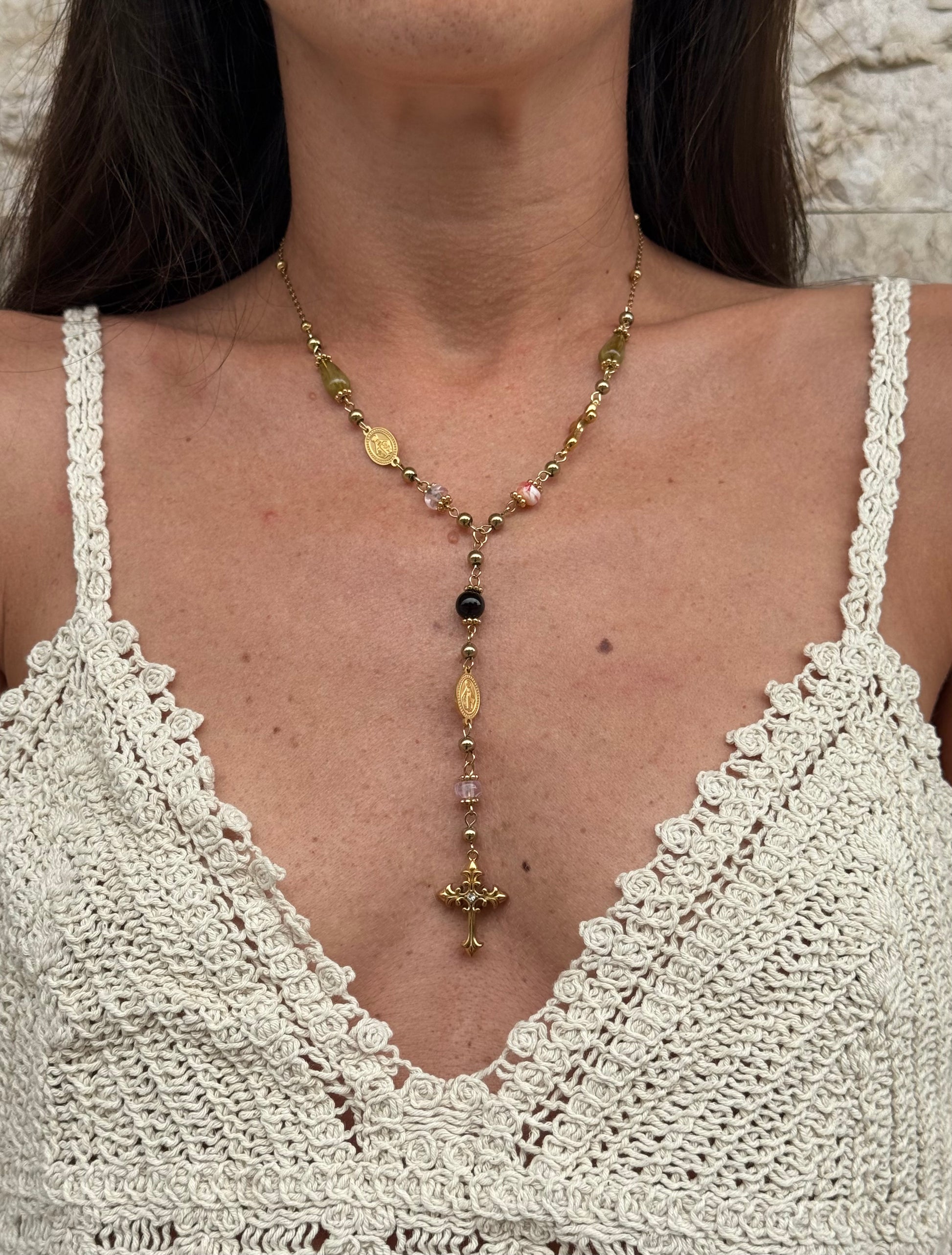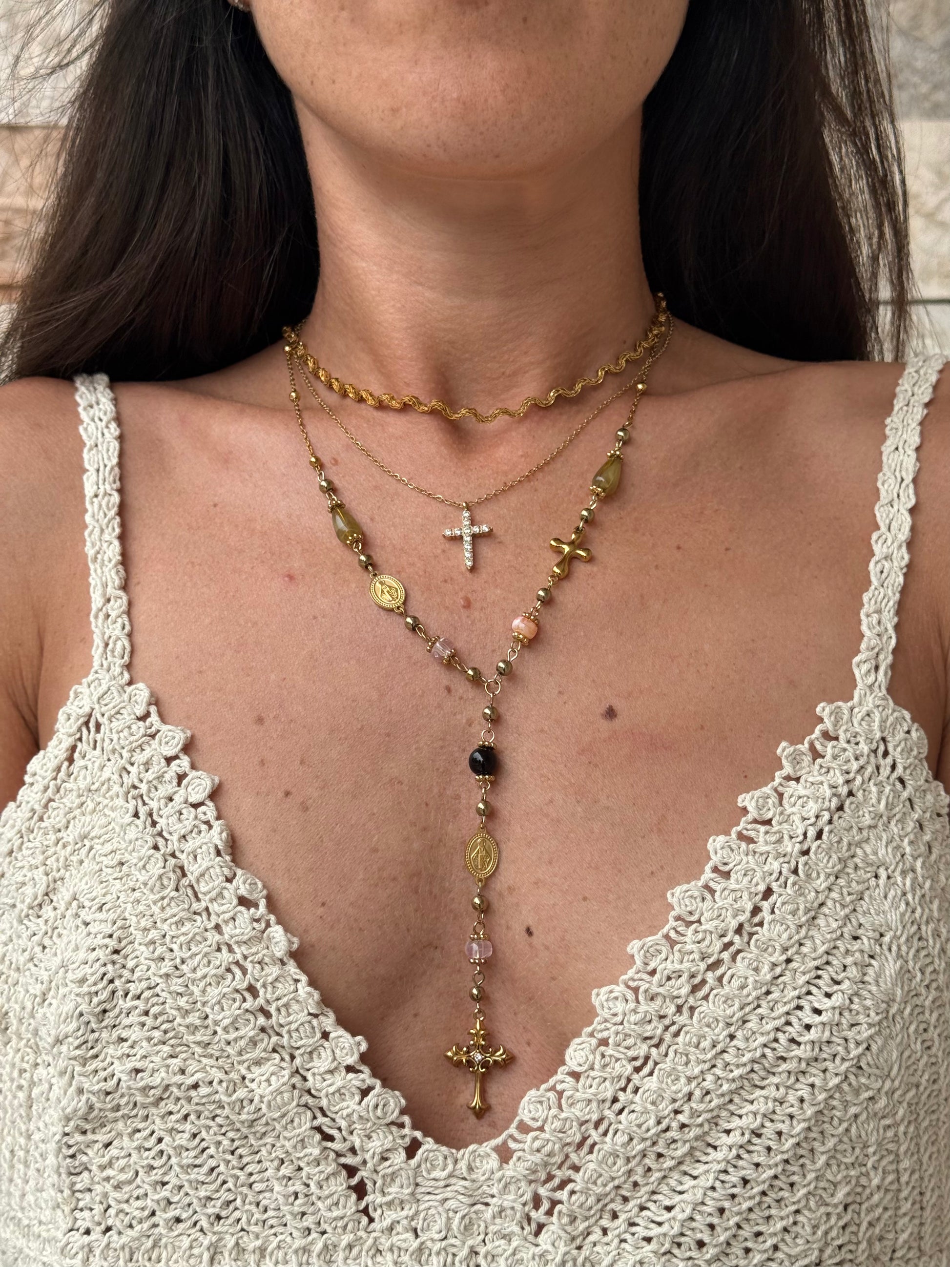 Nuova tendenza dell’estate, questa collana in acciaio inox unisce eleganza e stile contemporaneo. Le pietre dai toni caldi donano un tocco solare e raffinato. Il pendente a croce aggiunge un dettaglio distintivo e luminoso. Un accessorio che valorizza ogni outfit, must-have dell'estate.
