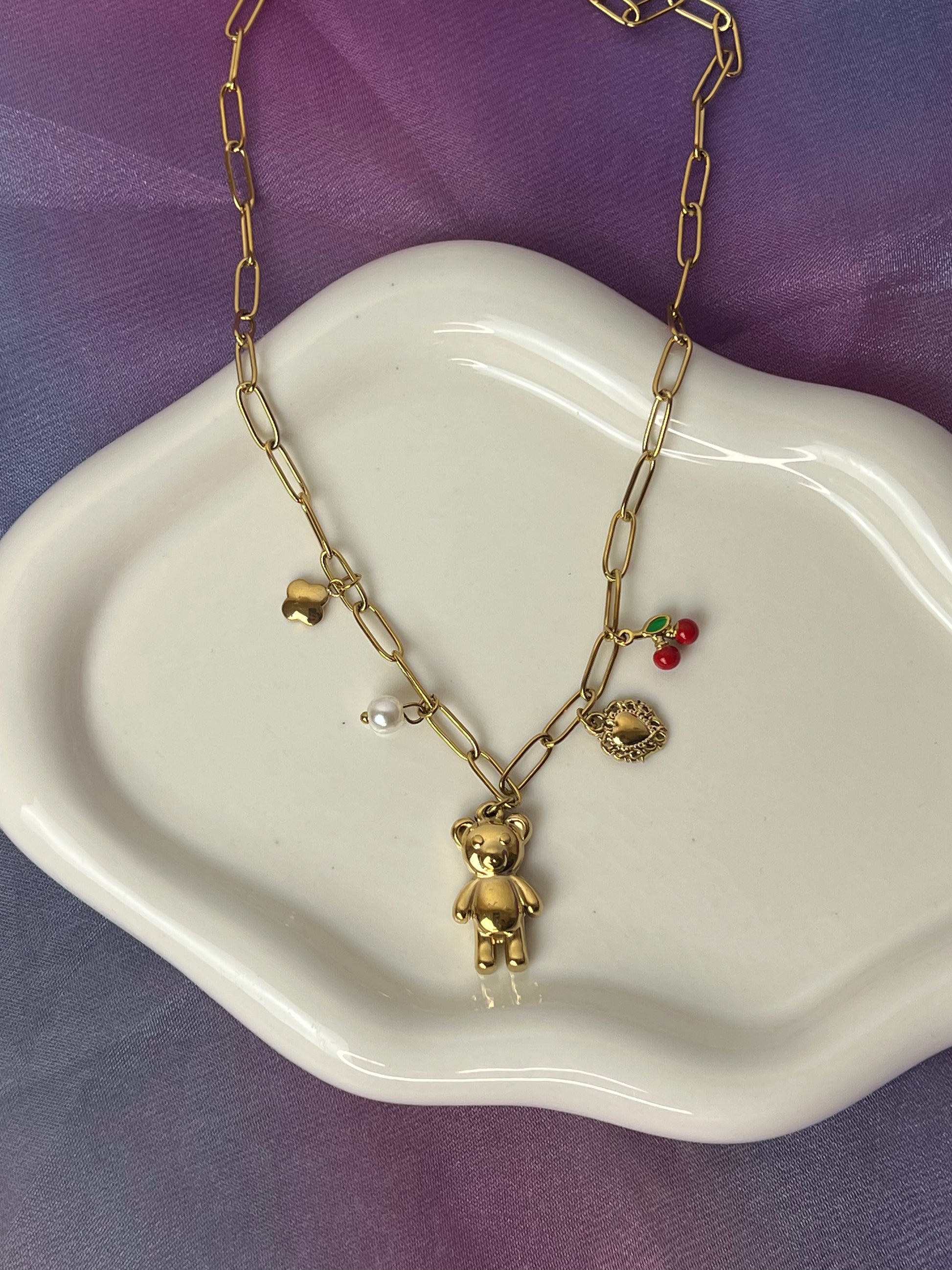 Collana elegante con charm centrale a forma di orso in acciaio inox lucido, accompagnato da piccoli charms decorativi. Un accessorio semplice ma d’effetto, ideale per ogni stile.