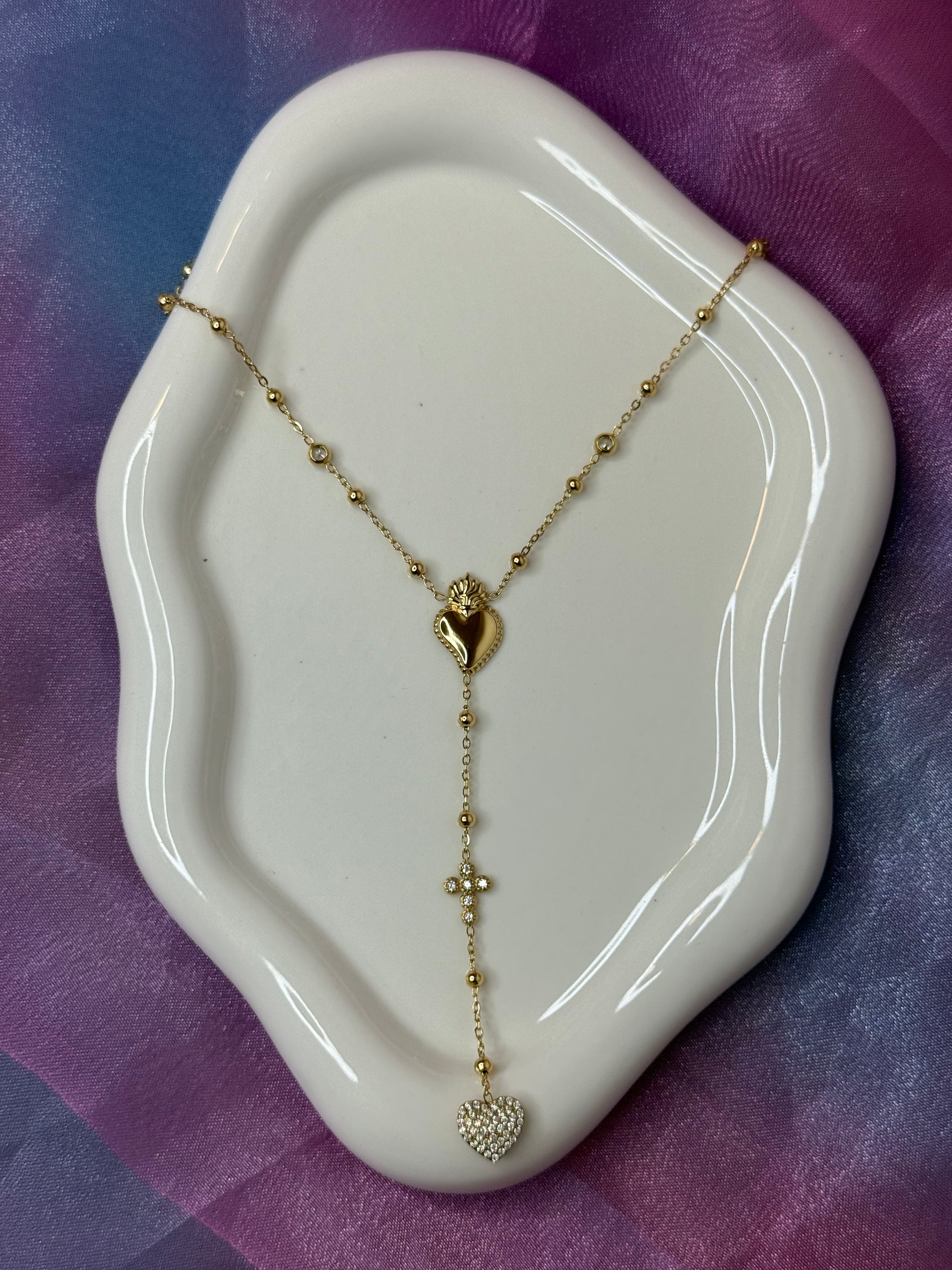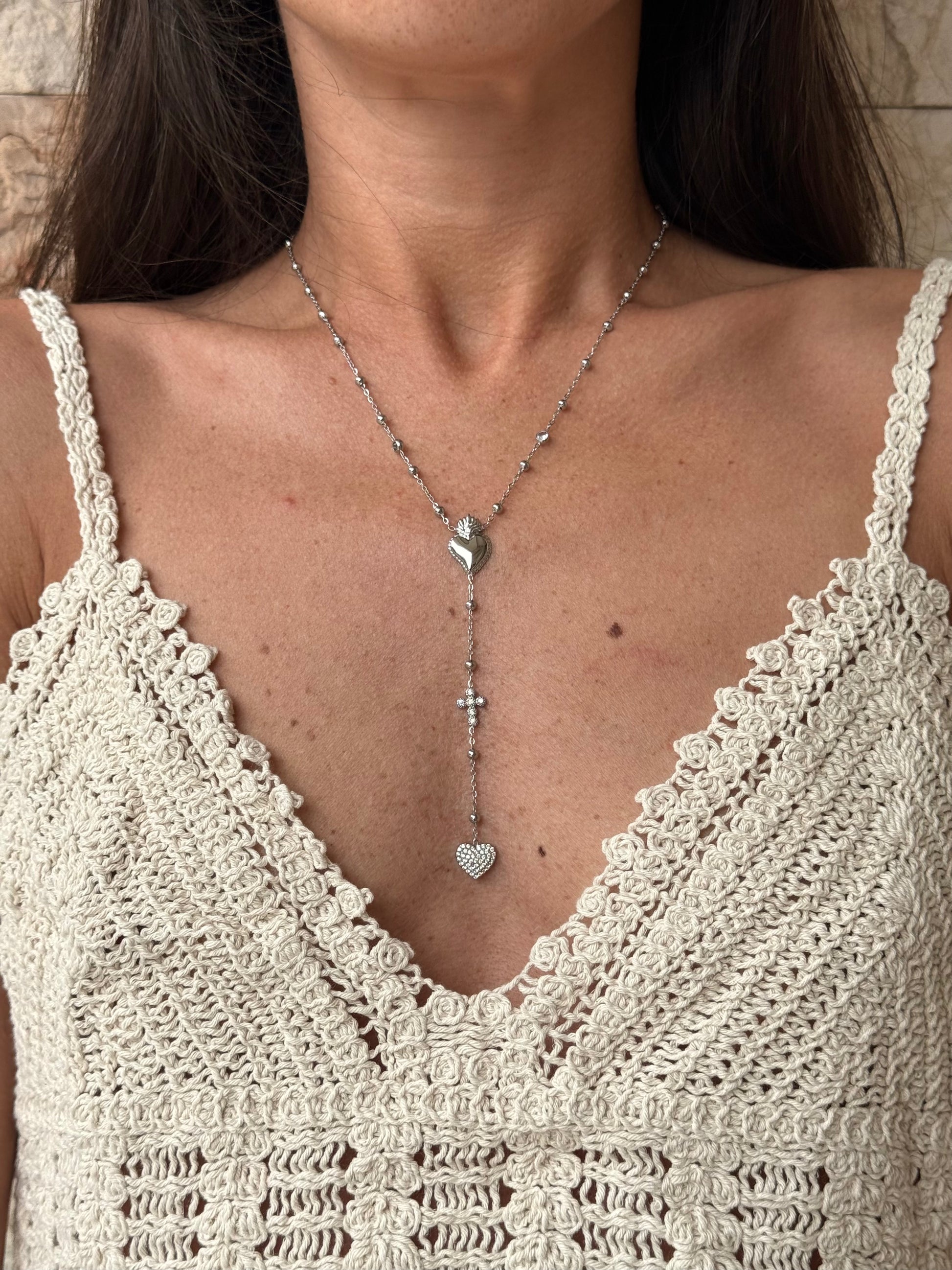 Nuova tendenza del momento, questa collana rosario in acciaio inox unisce stile e significato. Una catenina unita da un cuore sacro, una croce e un cuore decorato con strass è perfetta da indossare ogni giorno.