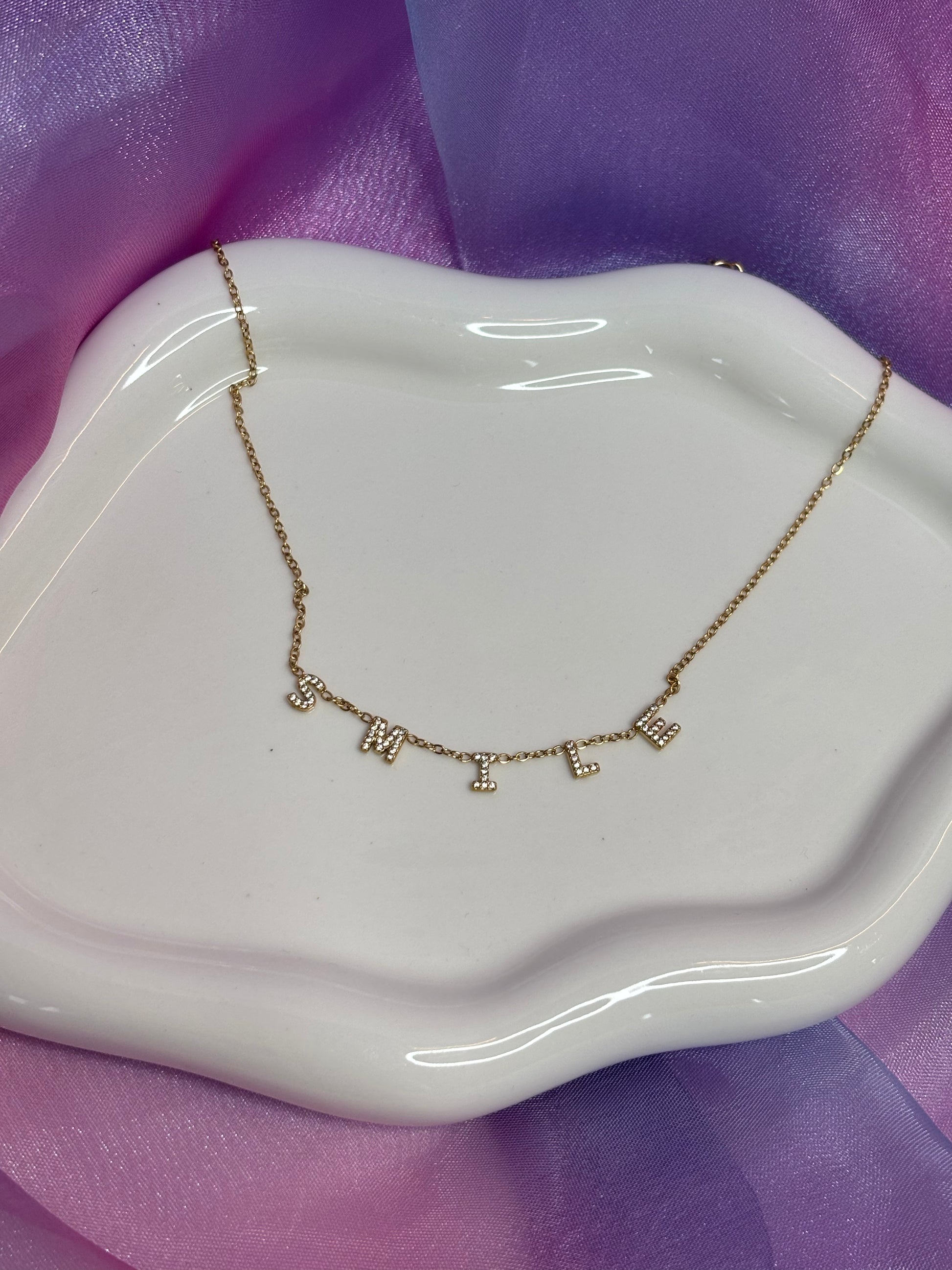 Collana con catenina sottile e al centro la scritta “smile” composta da letterine con brillantini, perfetta per aggiungere un tocco di luce e buonumore a ogni look. Perfetta da abbinare anche ad altre collane.