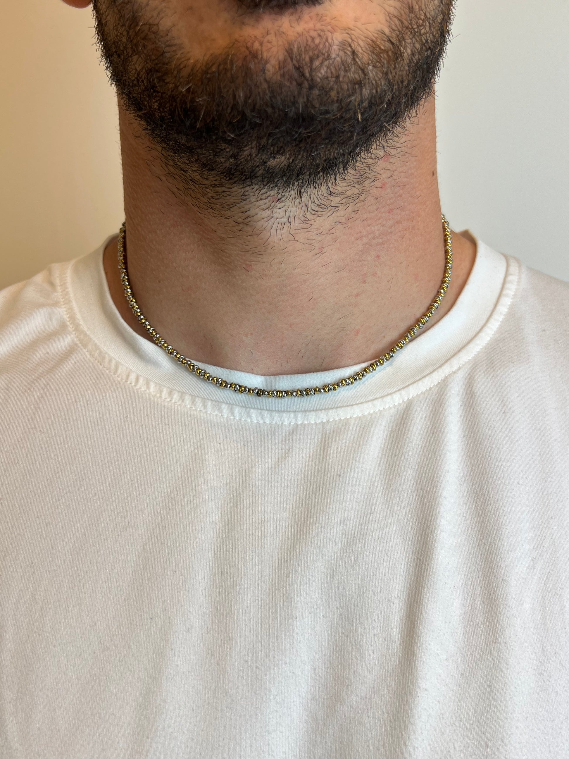 Collana da uomo girocollo in acciaio inox, composta da perline nei toni del dorato e dell’argento. Un design essenziale e contemporaneo, perfetto per aggiungere carattere e stile al look di tutti i giorni.
