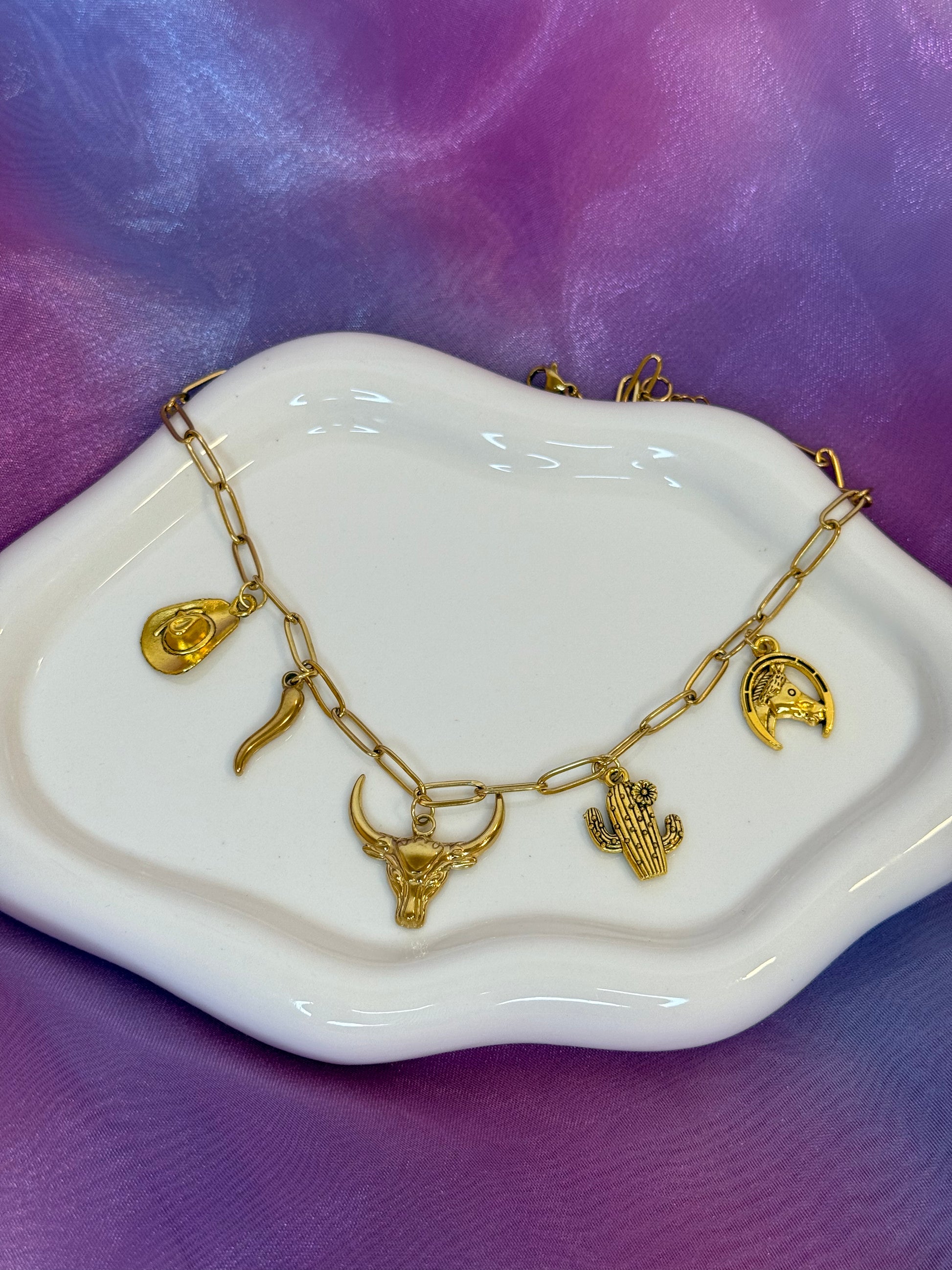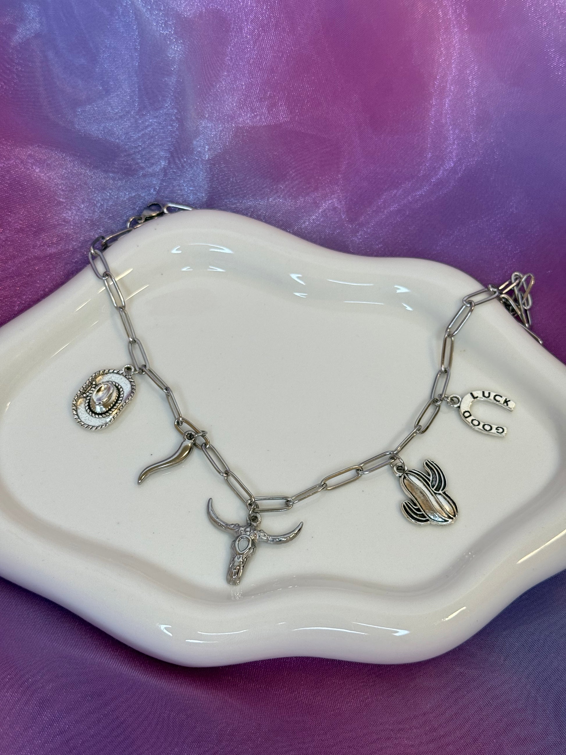 Collana hand made in acciaio inox con charms che richiamano lo spirito del West: cactus, cappello, ferro di cavallo e il bufalo. Ogni dettaglio è realizzato per avere un tocco unico e personale al tuo stile quotidiano. Perfetta per chi cerca un accessorio autentico e ricco di significato.