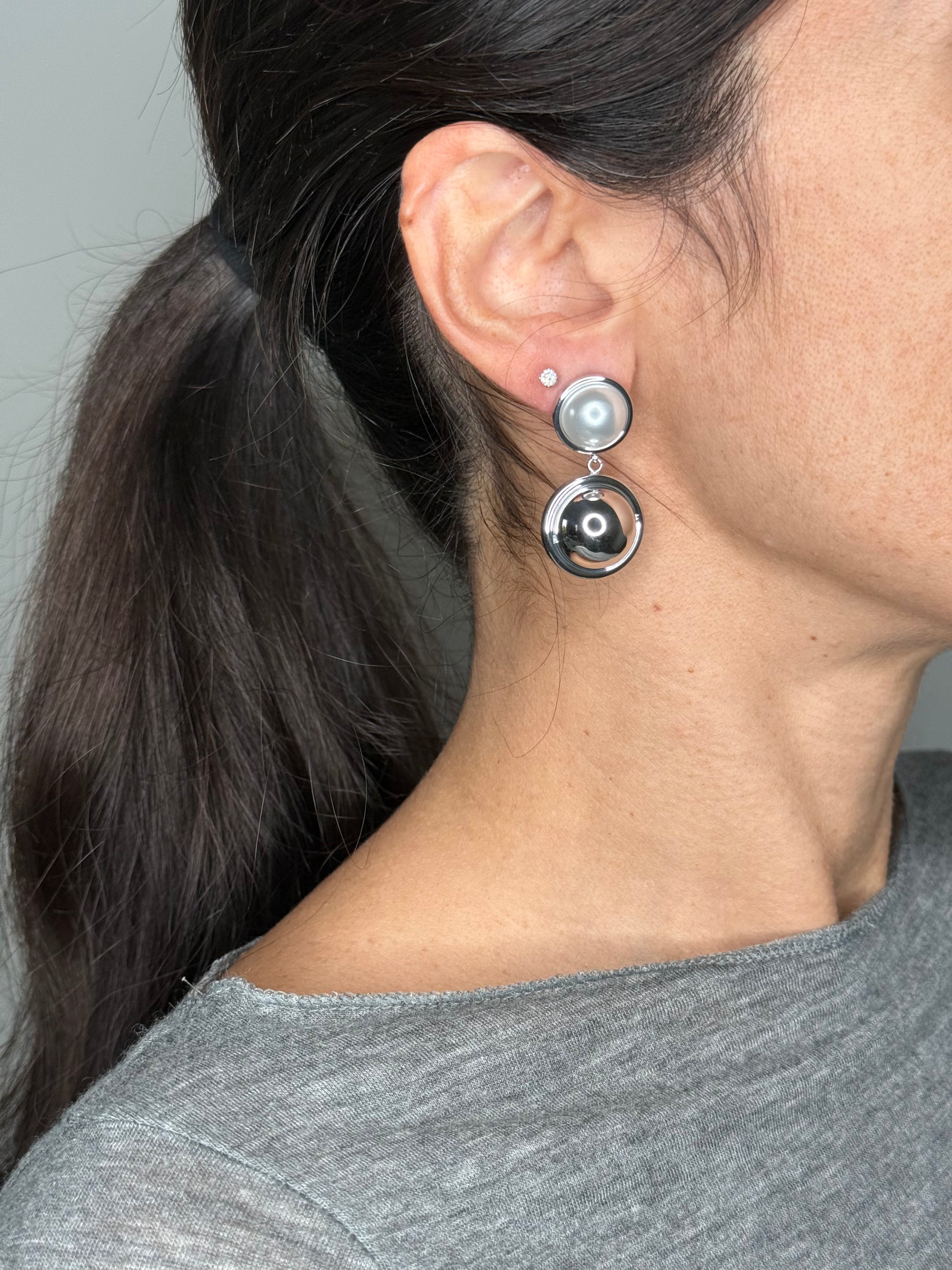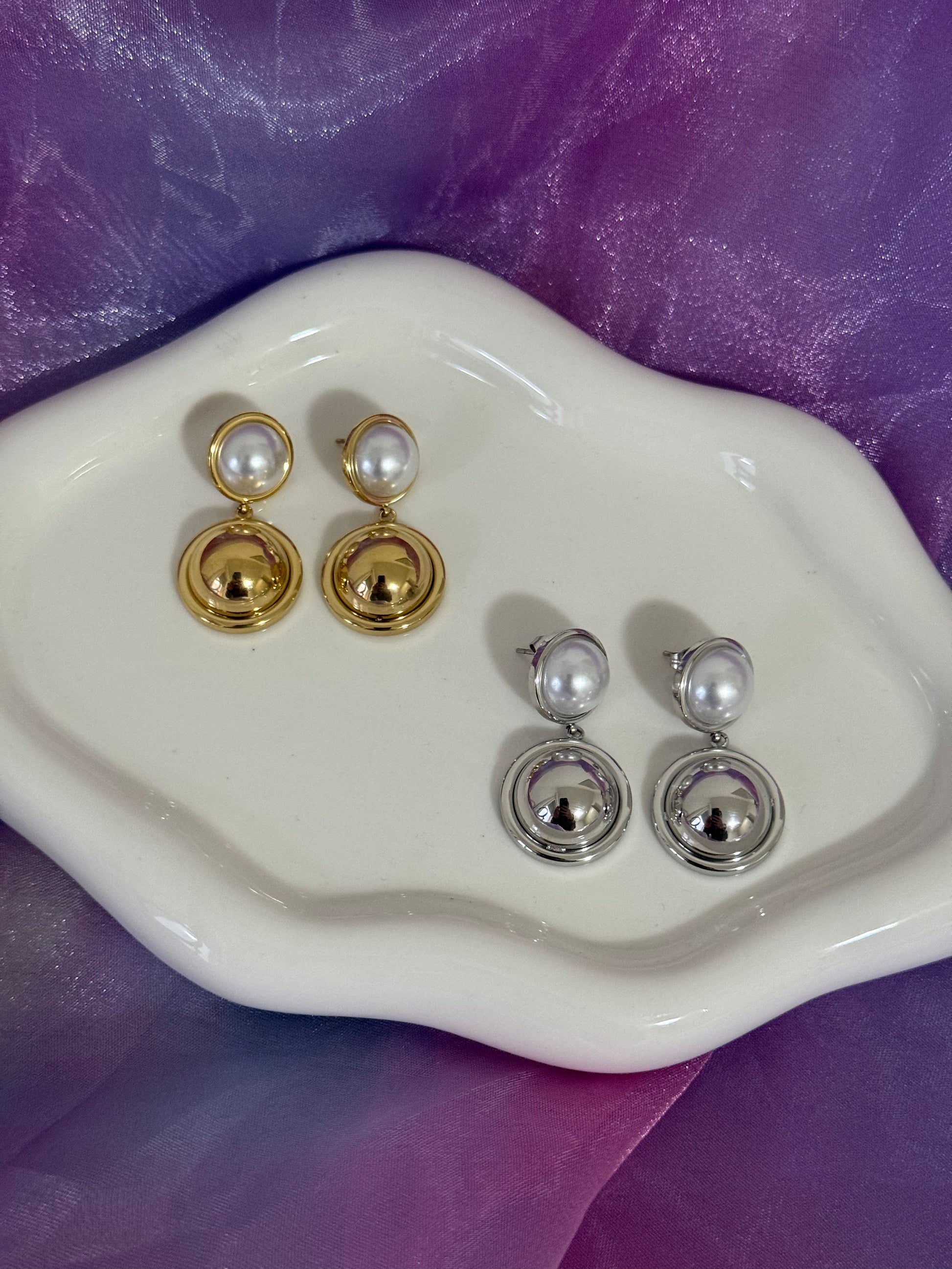 Orecchini in acciaio inox formati da due cerchi perfettamente uniti che accolgono una perla luminosa, simbolo di eleganza pura. Un gioiello che cattura la luce con grazia e femminilità.