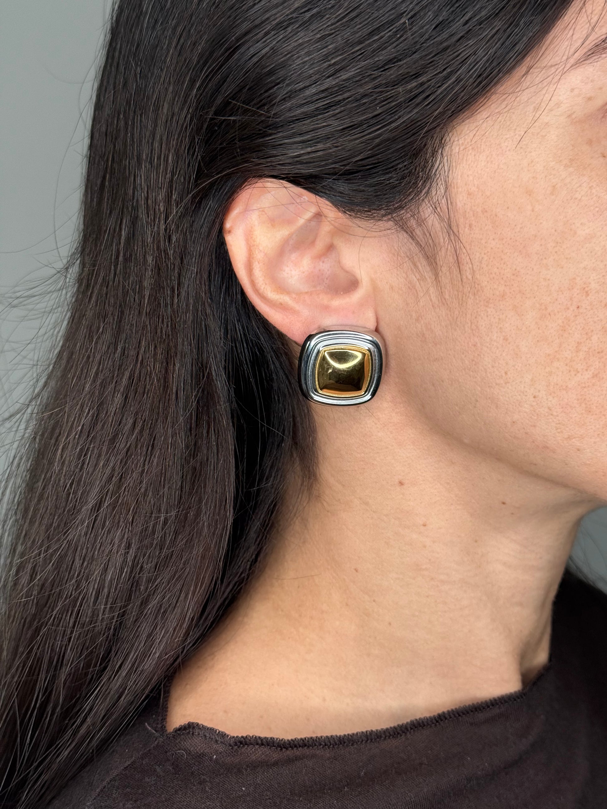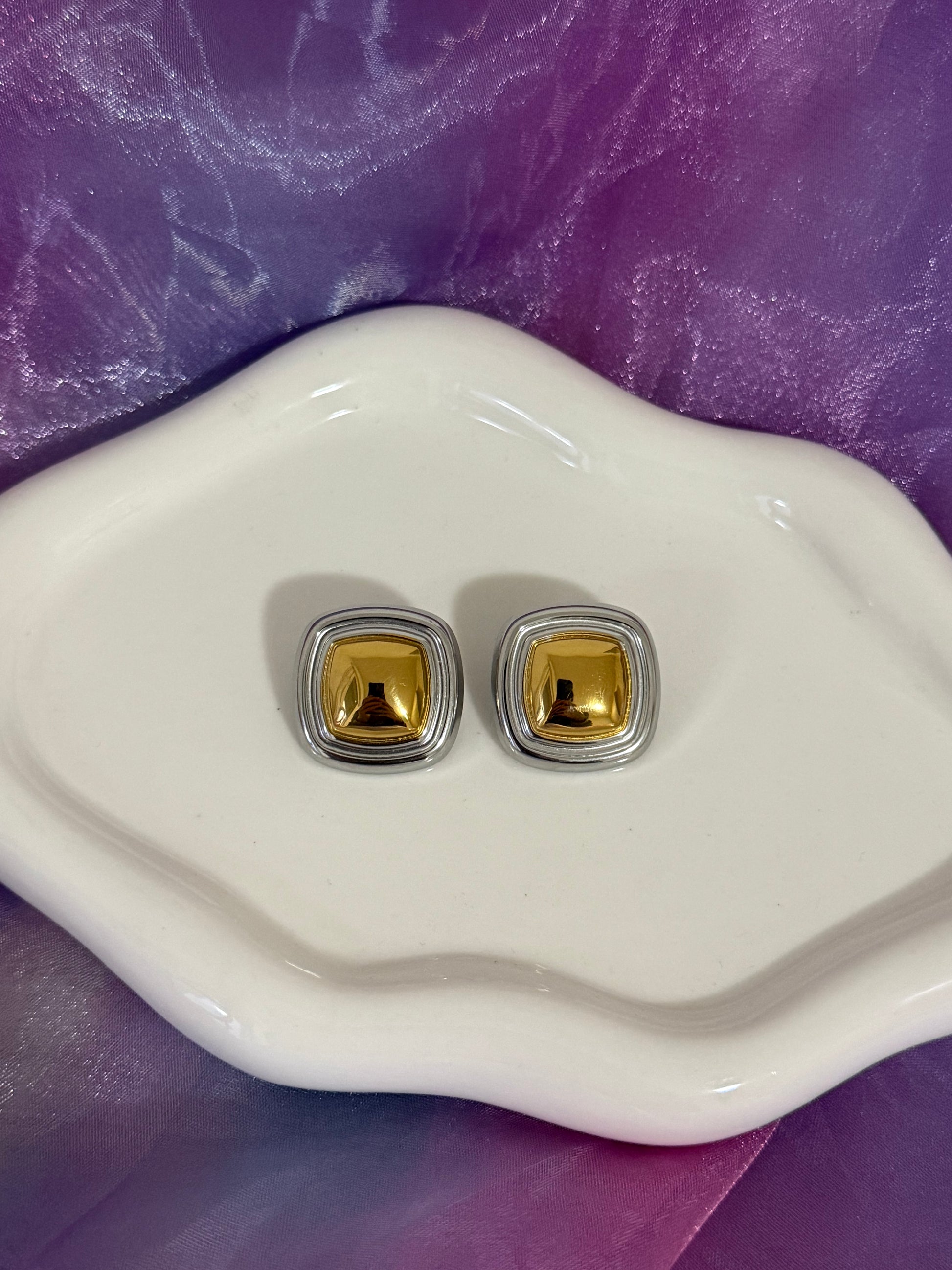 Orecchino quadrato dal design contemporaneo, impreziosito da un raffinato contrasto tra oro e argento per un effetto luminoso e sofisticato.