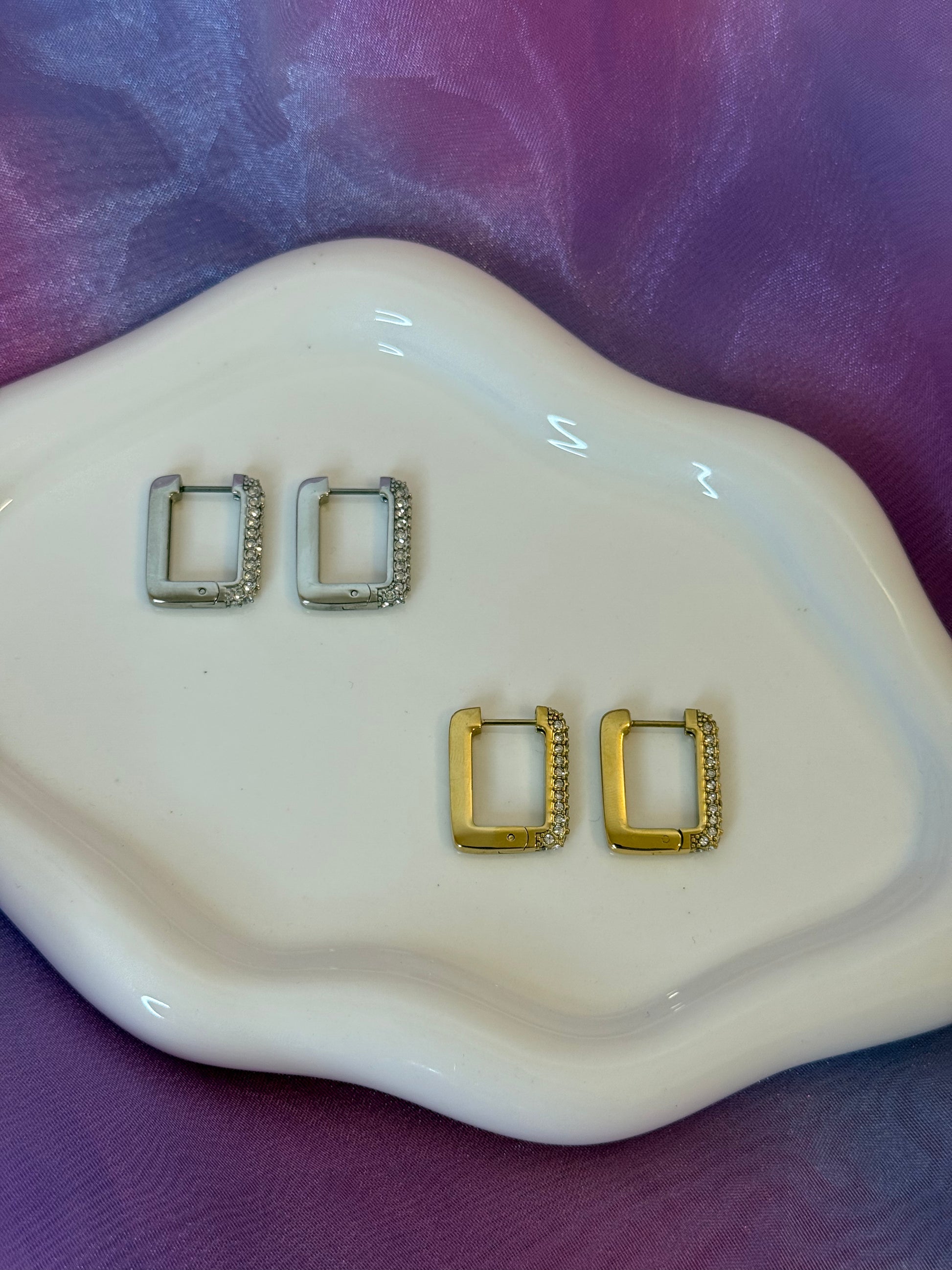 Eleganti e versatili, questi orecchini in acciaio inox hanno una forma rettangolare moderna, con un lato liscio e uno tempestato di brillantini. Indossali dritti per un tocco luminoso, o rovesciati per un look minimal. Anallergici e resistenti all’acqua, perfetti per ogni occasione.