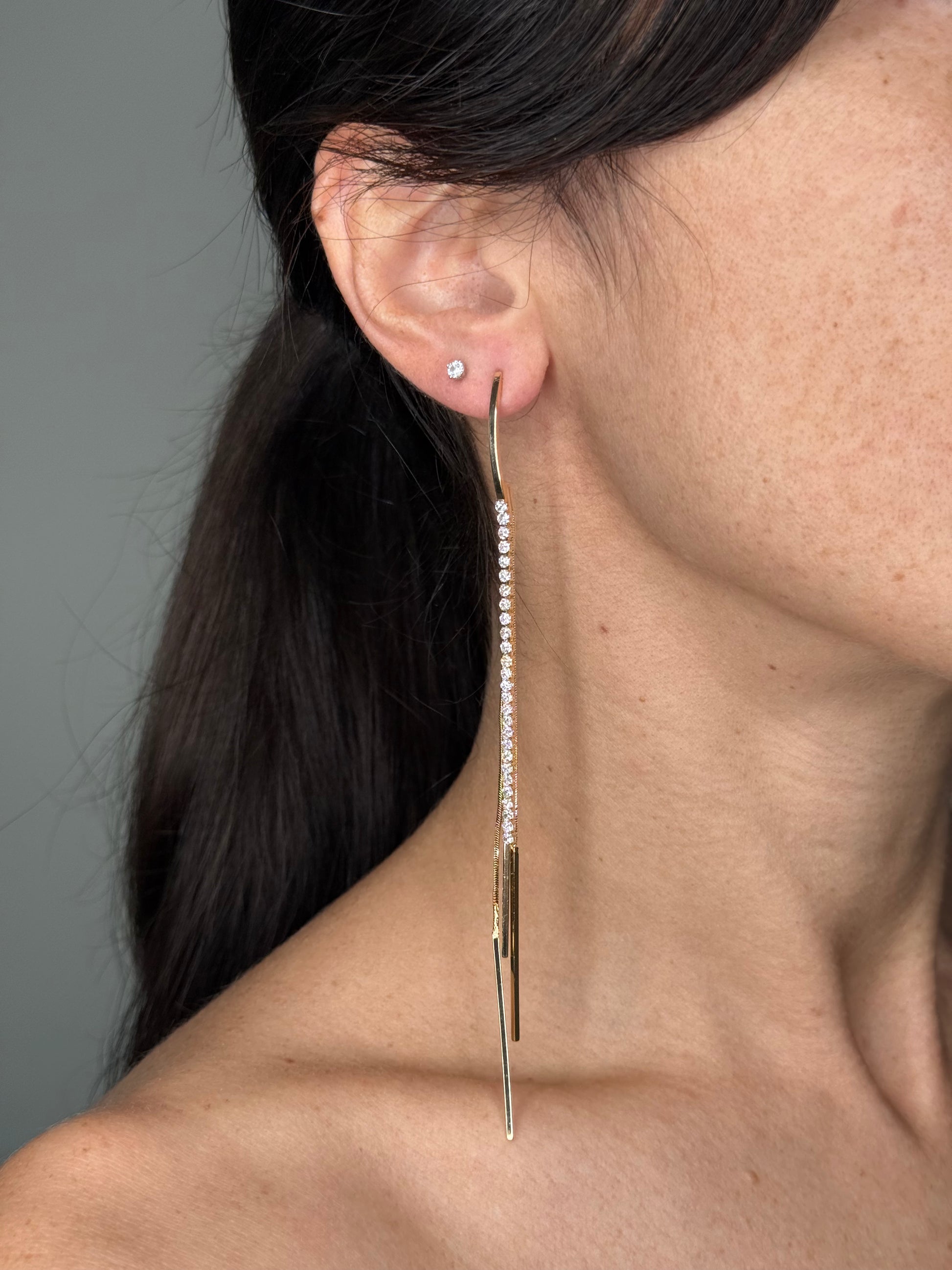 Orecchini con fili pendenti impreziositi da un filo di strass che cattura la luce ad ogni movimento. Un tocco di lusso accessibile per chi ama brillare con stile, perfetti per occasioni speciali o per elevare il quotidiano con un dettaglio sofisticato.