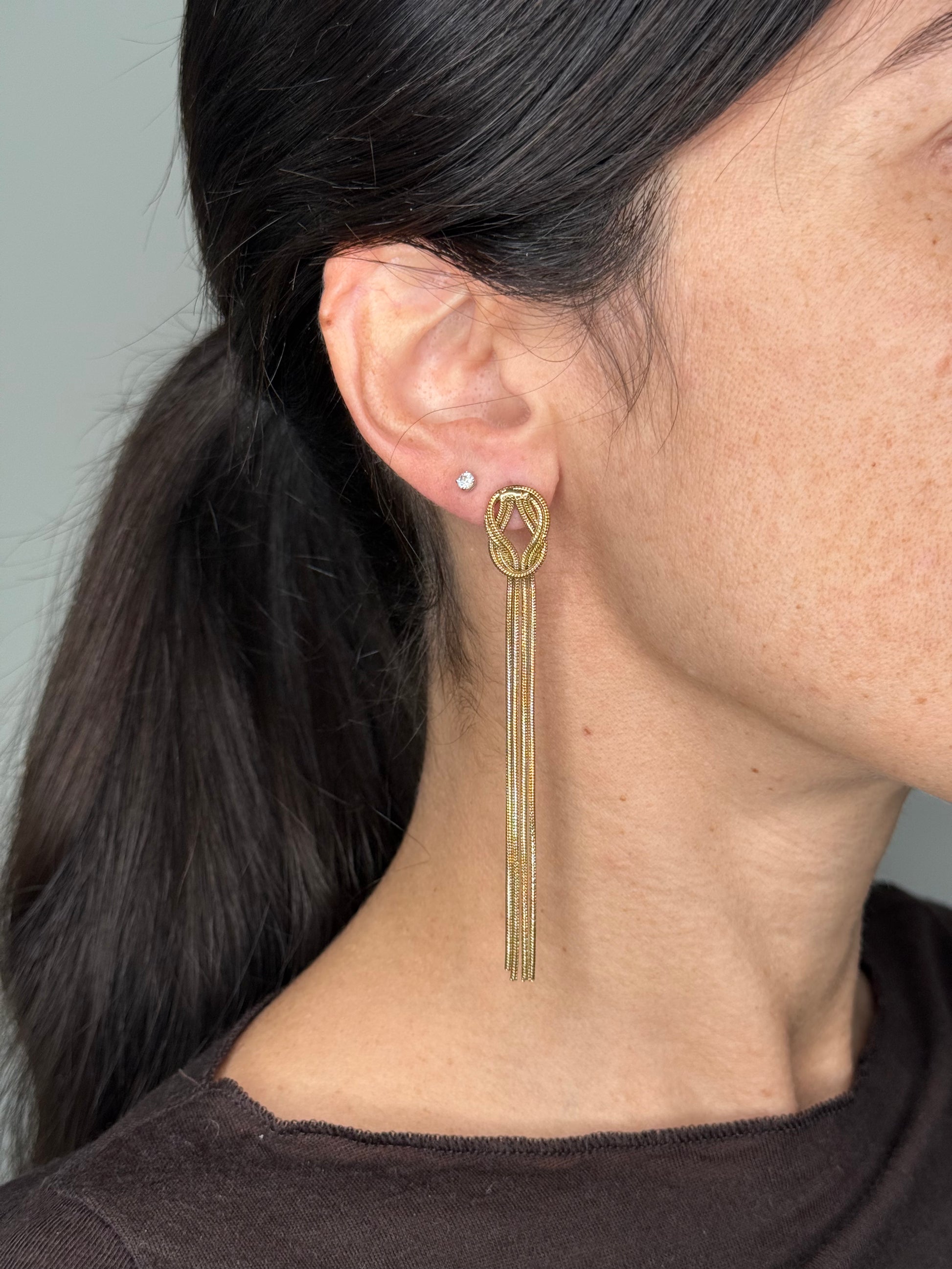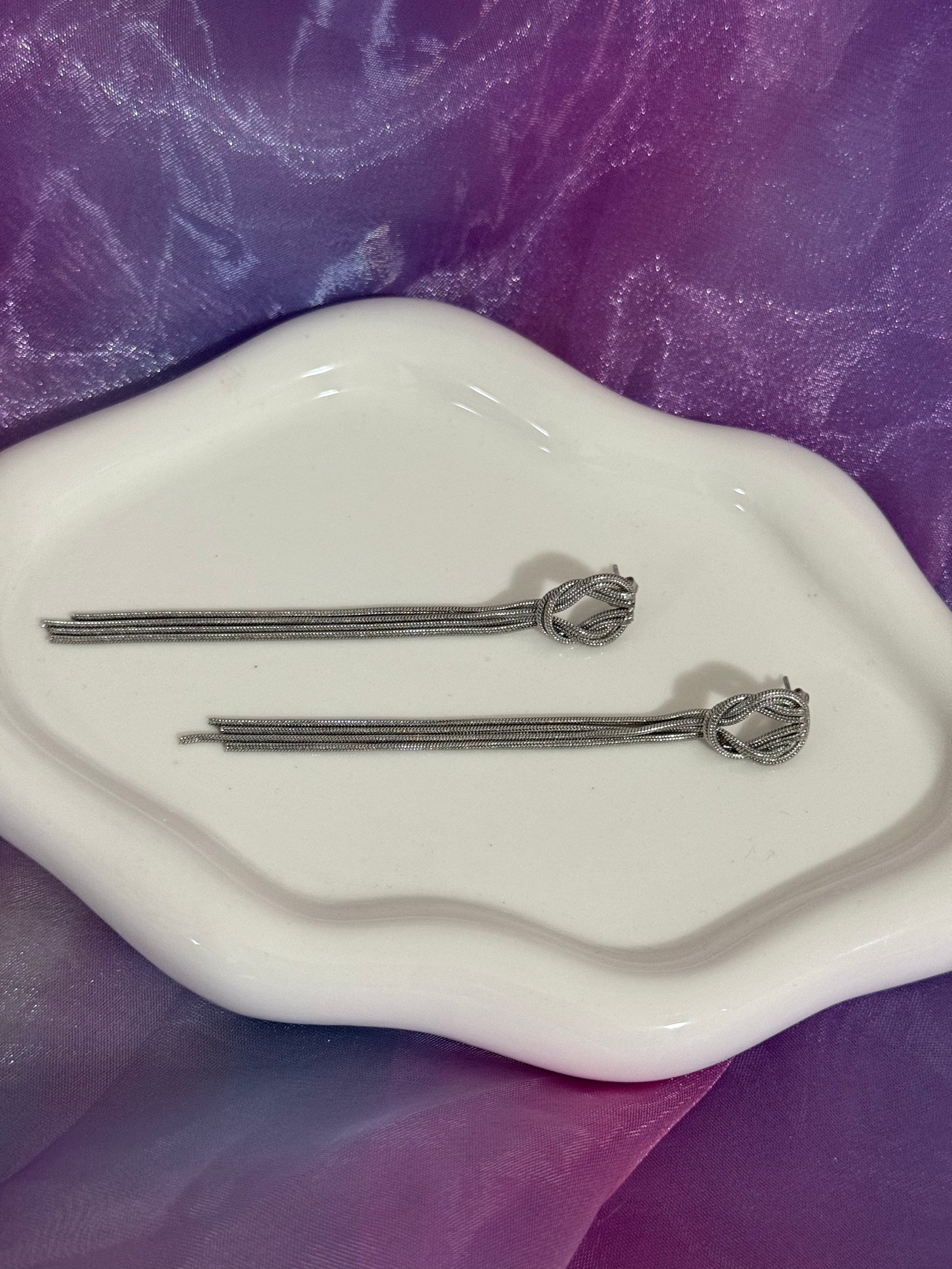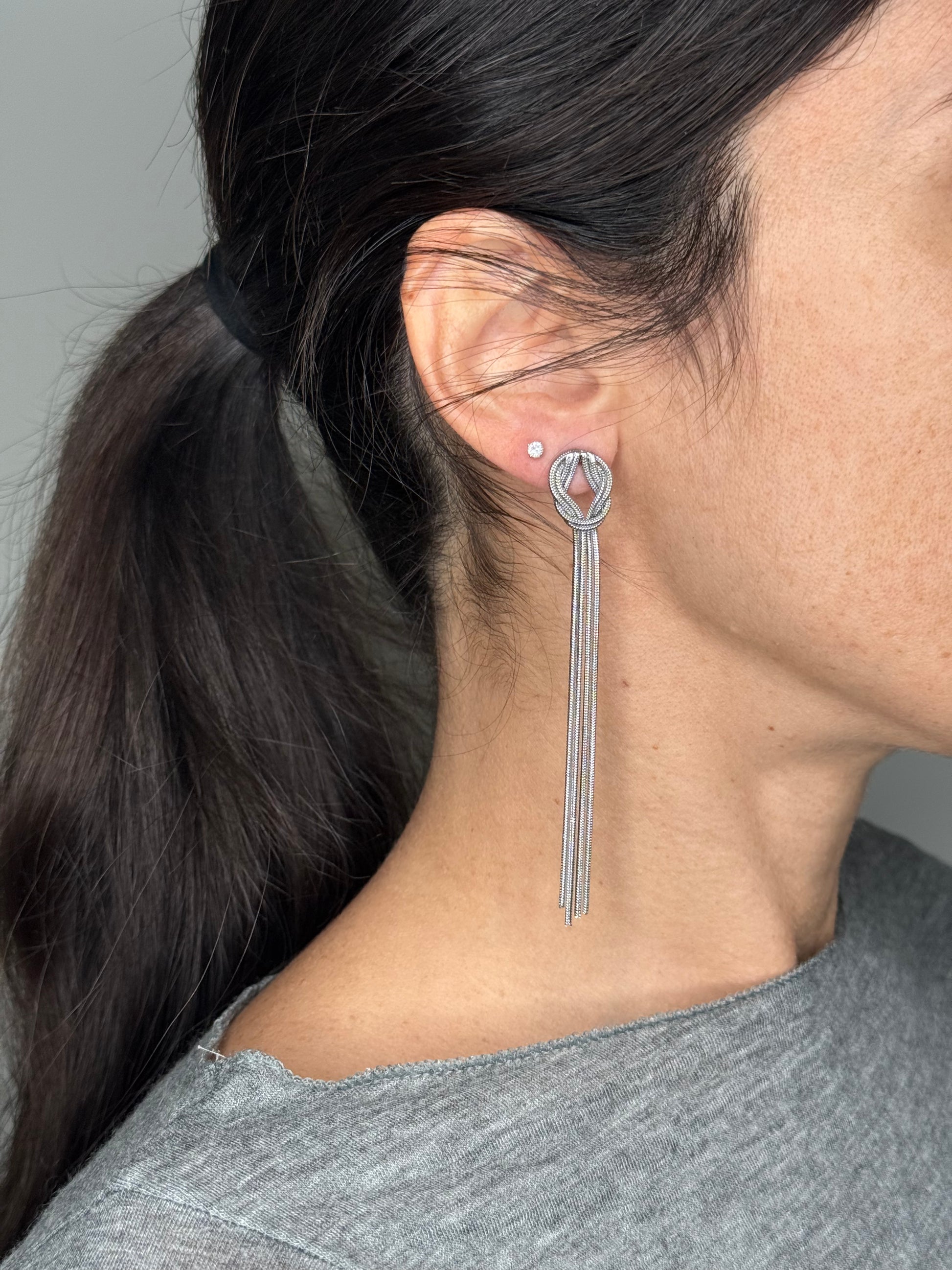 Orecchini in acciaio inox che catturano lo sguardo con un design sofisticato. Caratterizzati da un elegante nodo centrale da cui scendono delicati fili, creano un effetto movimento e leggerezza. Perfetti per chi ama uno stile minimalista ma ricercato, resistenti e ipoallergenici. Un accessorio versatile che valorizza qualsiasi look.