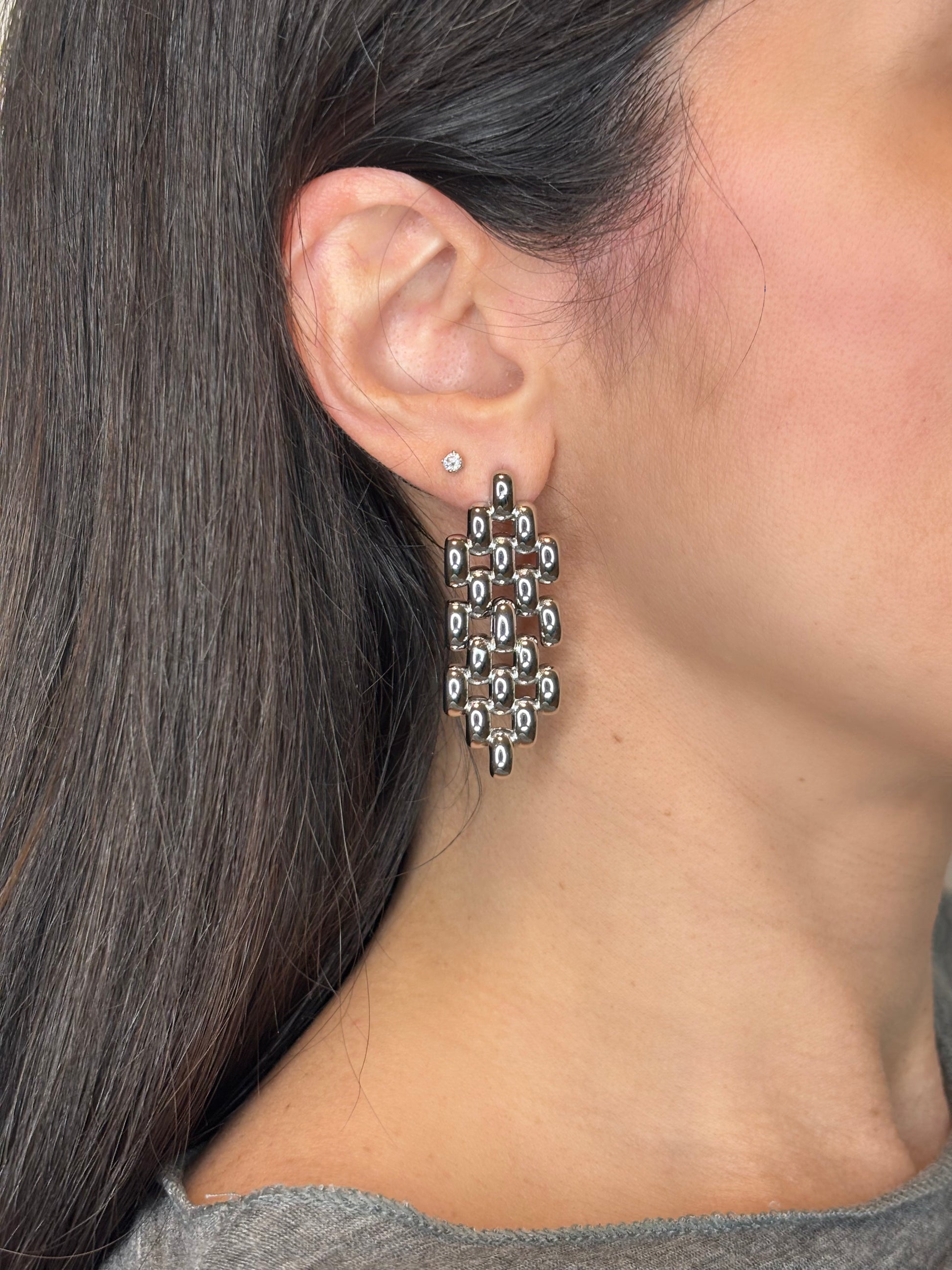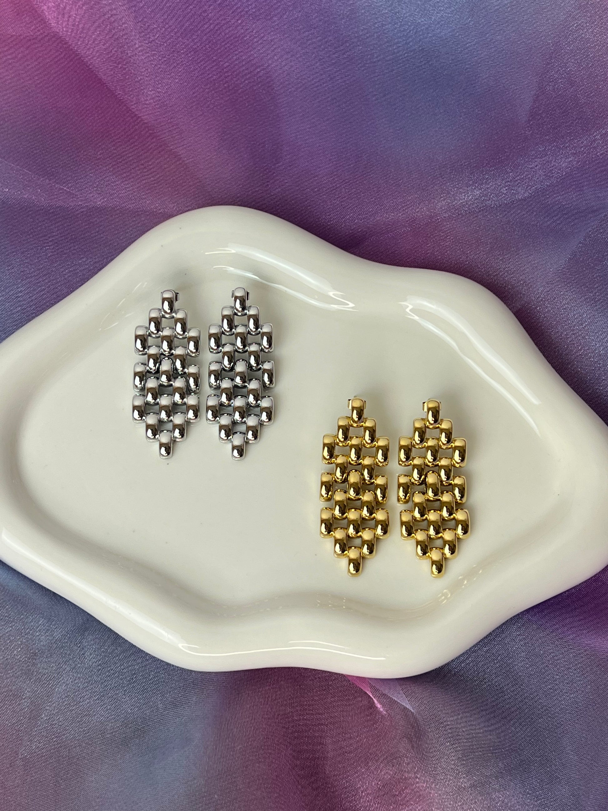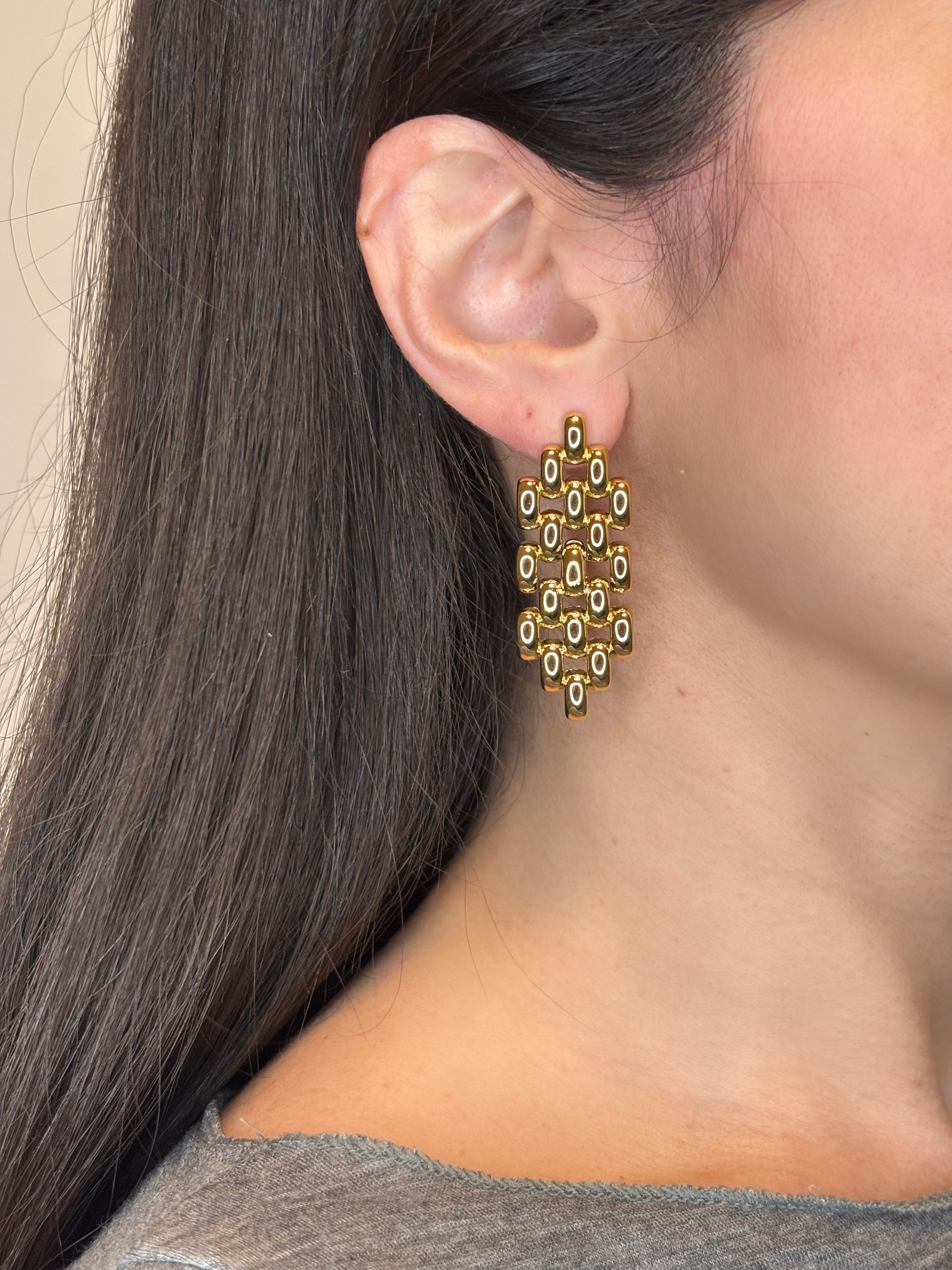Orecchini in acciaio inox composti da una serie di piccoli rettangoli uniti tra loro, che si muovono leggeri creando l’effetto di una cascata scintillante. Un design moderno e dinamico, perfetto per aggiungere eleganza e movimento al tuo look.