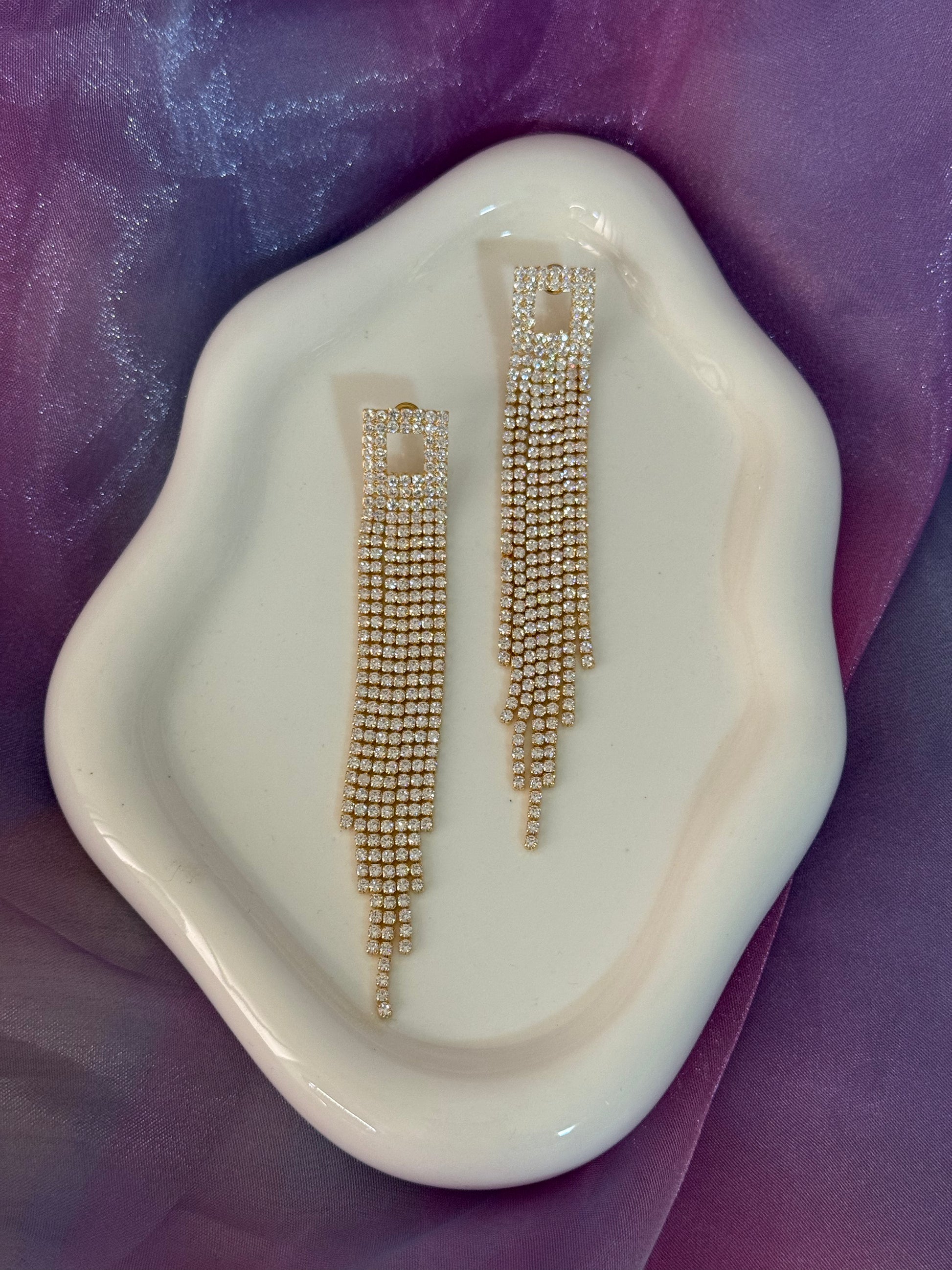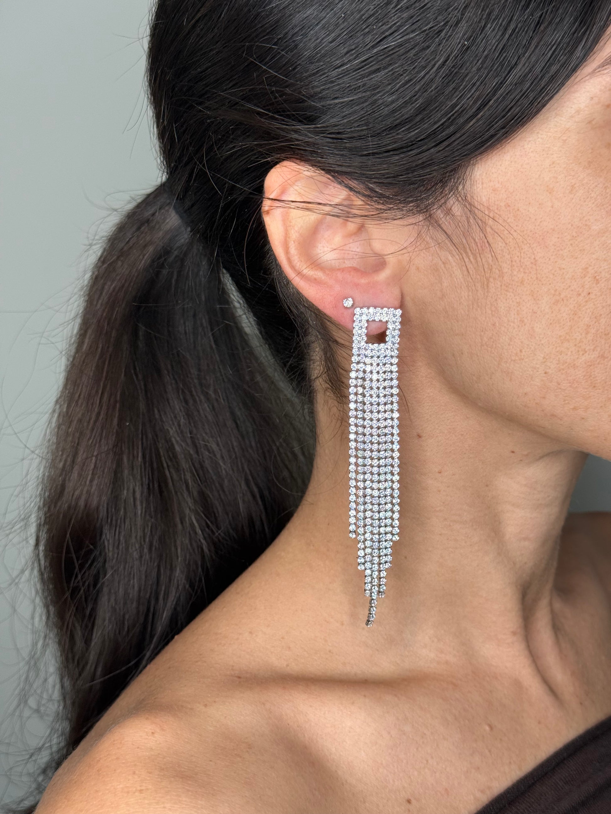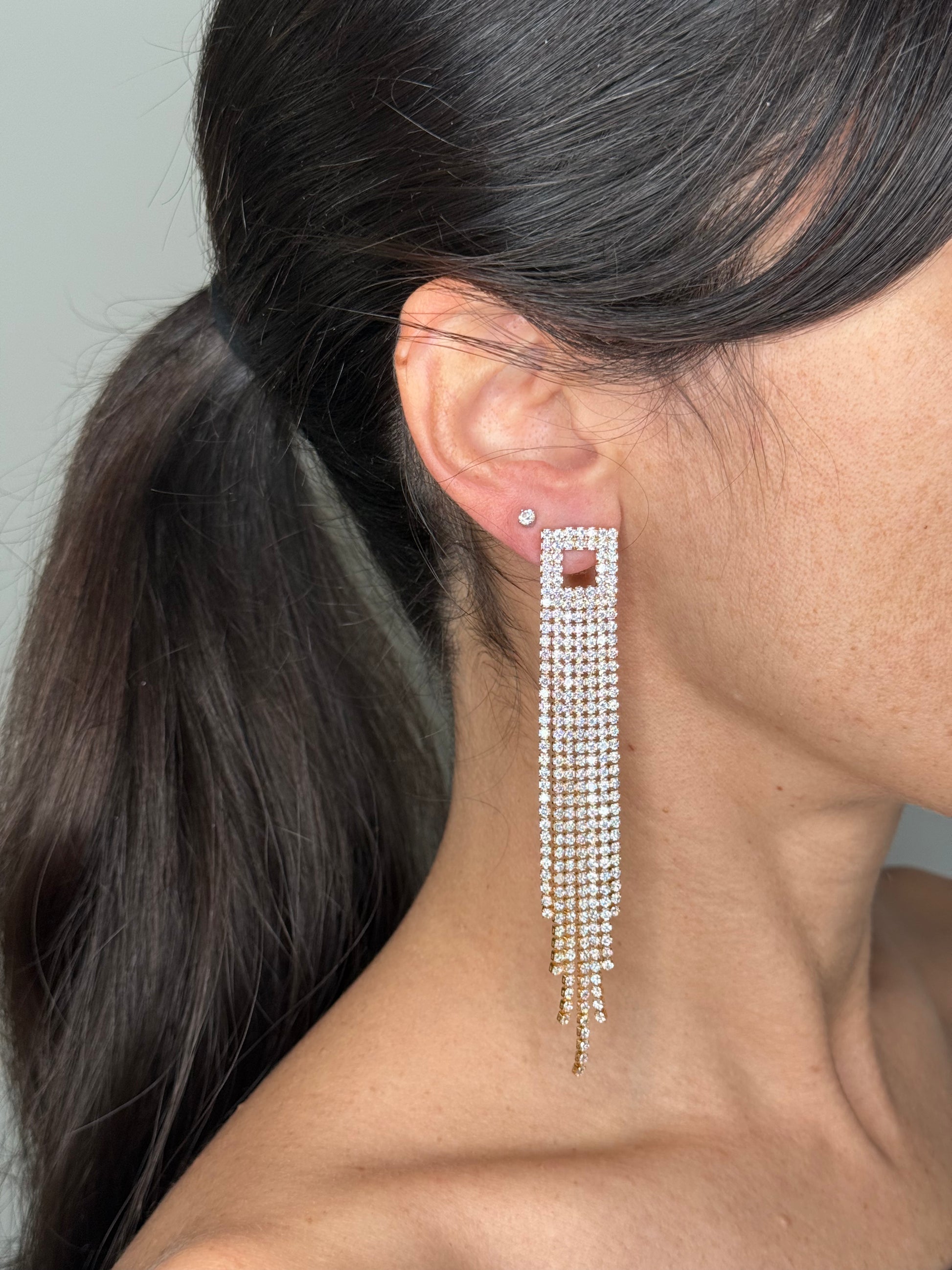 Orecchini con quadrato geometrico e cascata di fili strass scintillanti. Un accessorio audace che cattura la luce e gli sguardi, perfetto per chi desidera brillare nelle occasioni speciali senza passare inosservata.