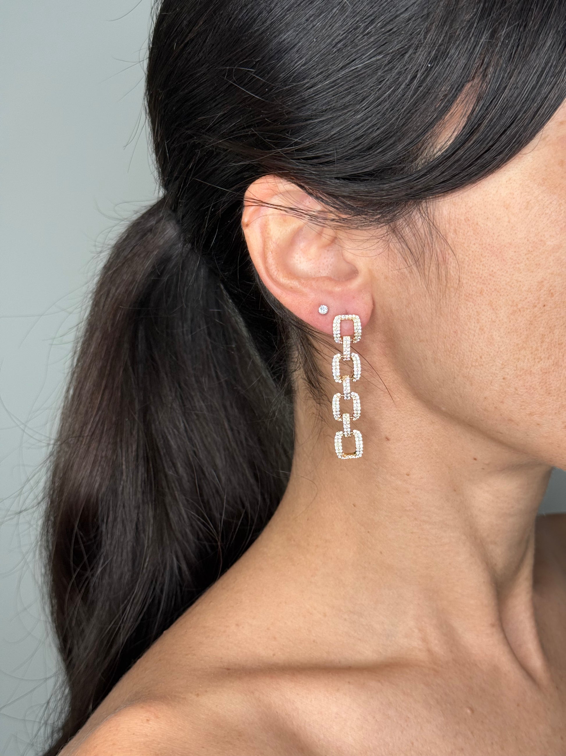 Orecchini pendenti a forma di catena che brillano di strass luminosi, perfetti per aggiungere un tocco di glamour a qualsiasi look. Dal giorno alla sera, sono il dettaglio sofisticato che completa il tuo stile con grazia e movimento.