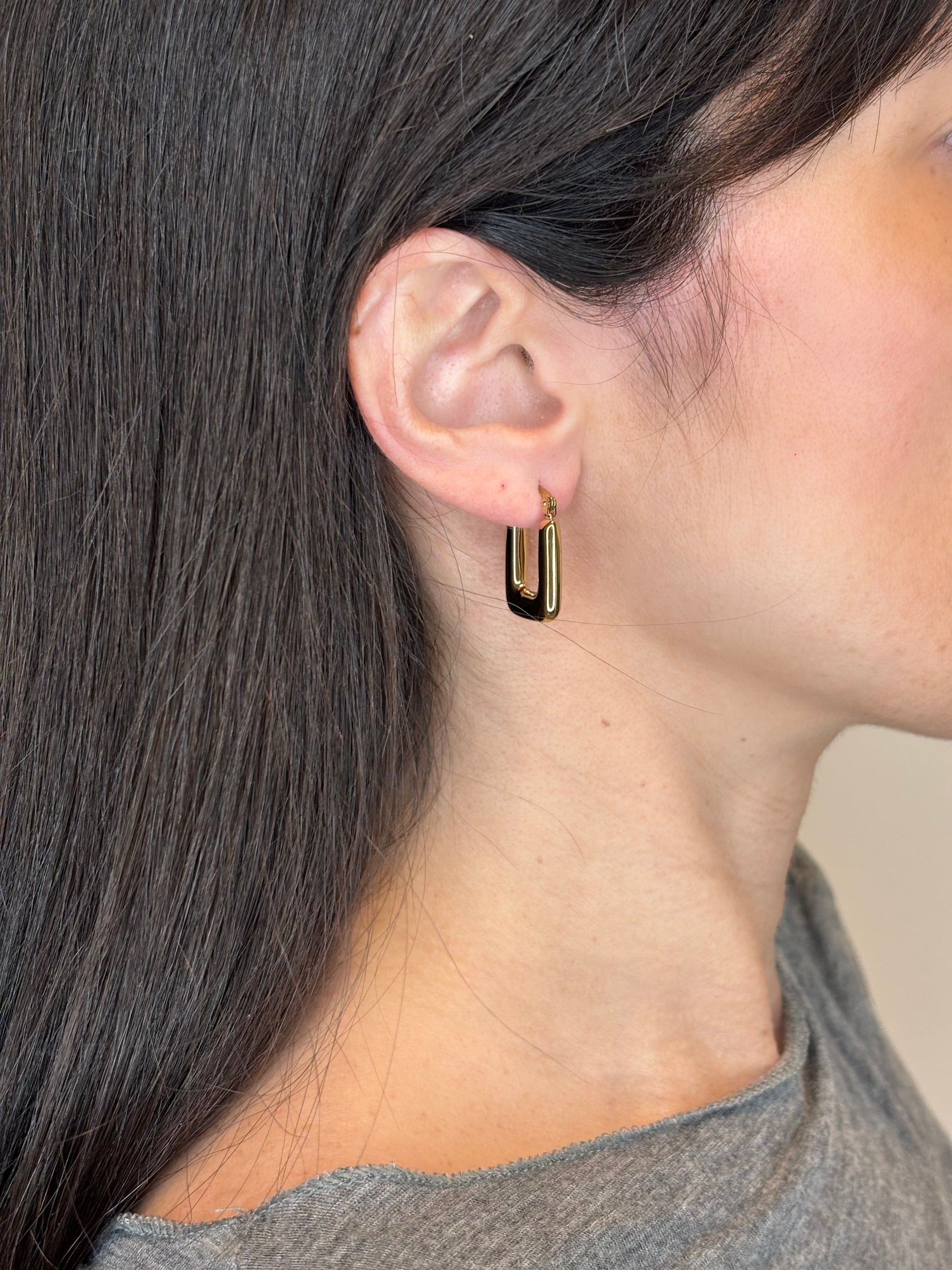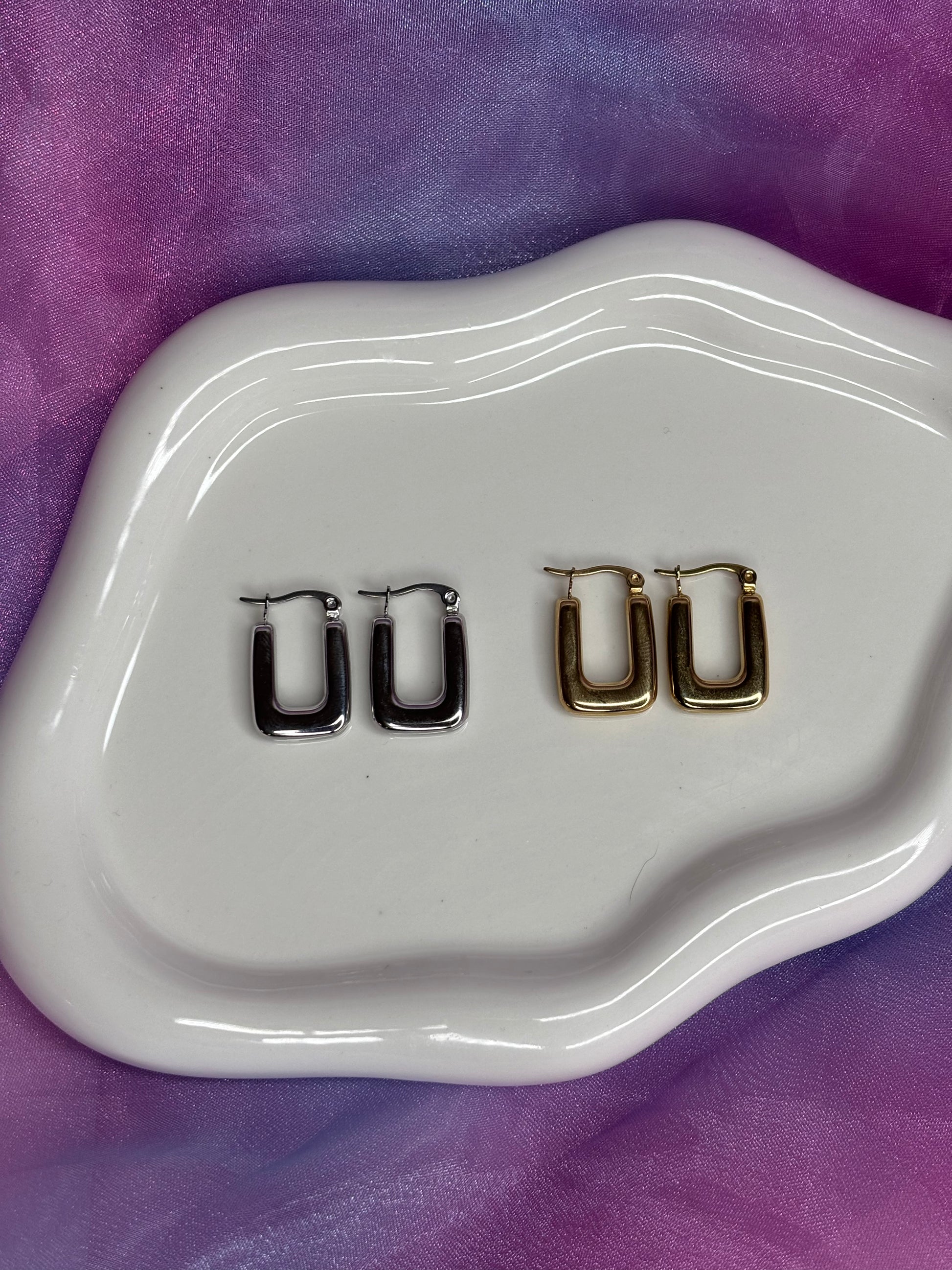 Orecchini dal design essenziale e contemporaneo, caratterizzati da piccoli rettangoli luminosi dalle linee pulite e geometriche. Un accessorio elegante e di tendenza, ideale per chi ama uno stile minimal ma d’effetto.