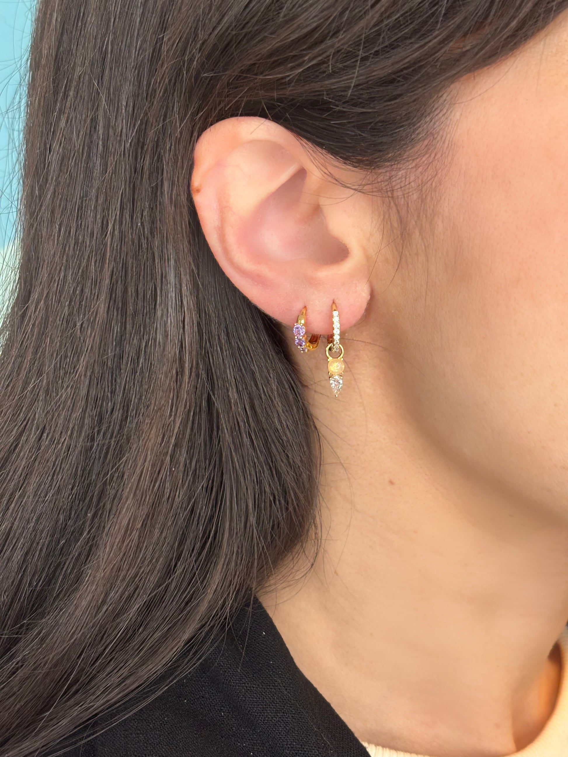 Orecchini a cerchio in ottone, impreziositi da zirconi colorati che donano luce e vivacità. Un design delicato e brillante, perfetto da indossare da soli o abbinati ad altri orecchini per un look fresco e personalizzato.