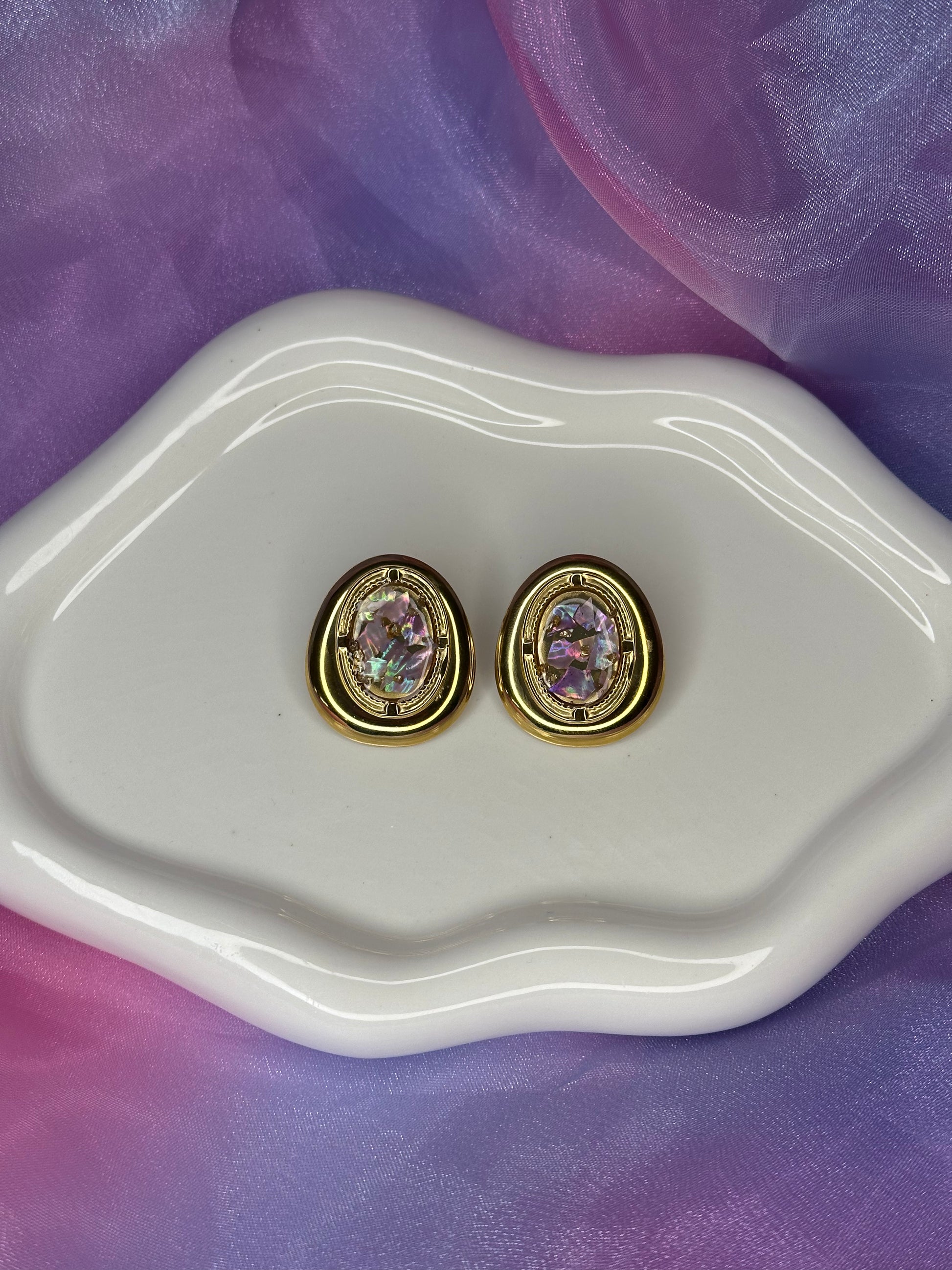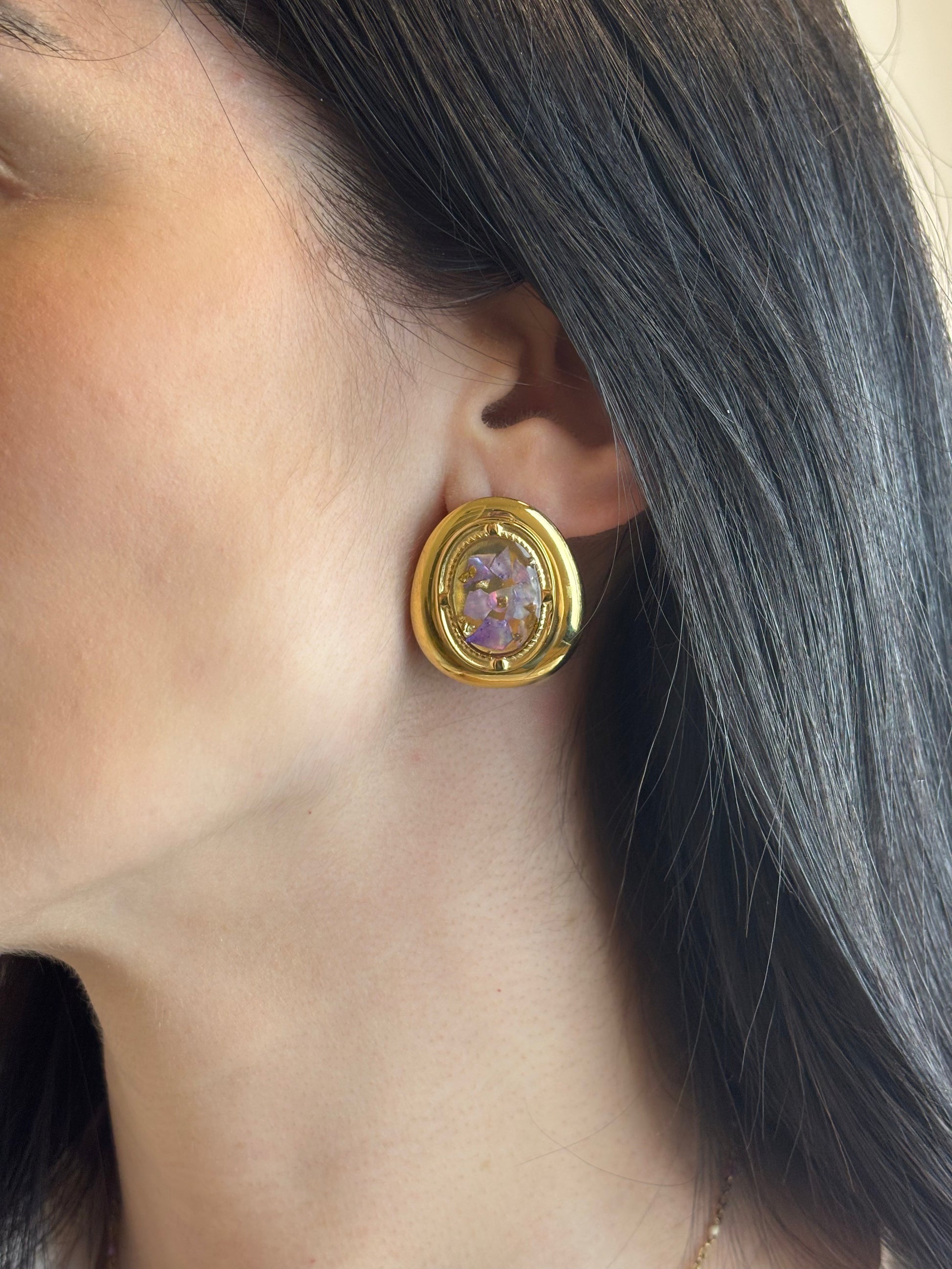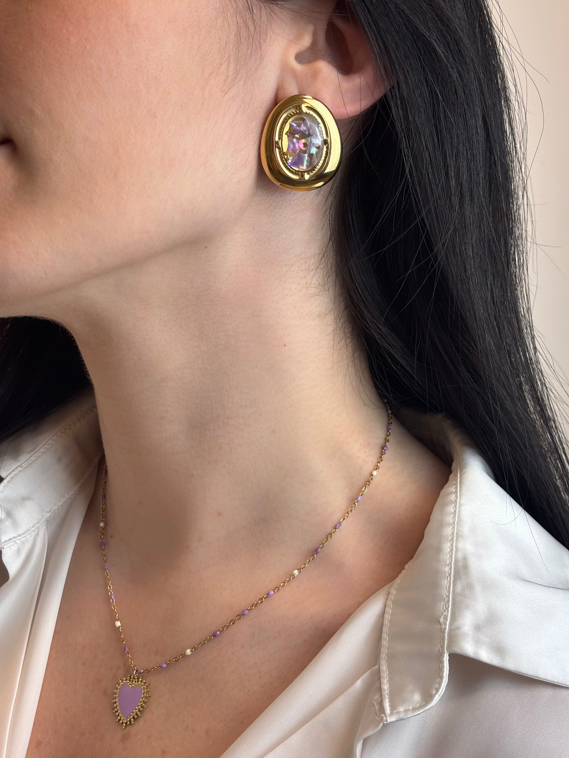 Orecchini dorati a forma di grande goccia, al cui interno è incastonata una pietra colorata luminosa sui toni del lilla che cattura la luce con intensità. Un design elegante e raffinato, perfetto per valorizzare il viso con un tocco di colore e charme.